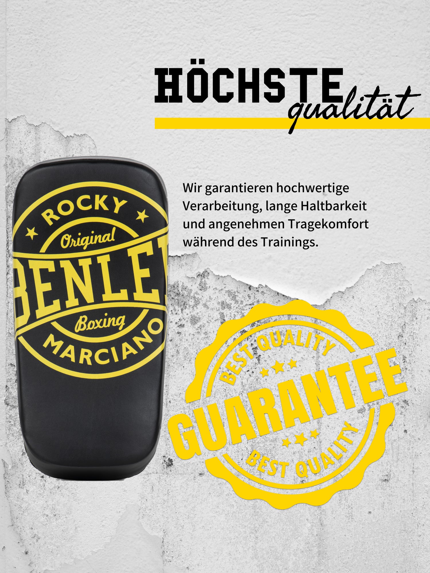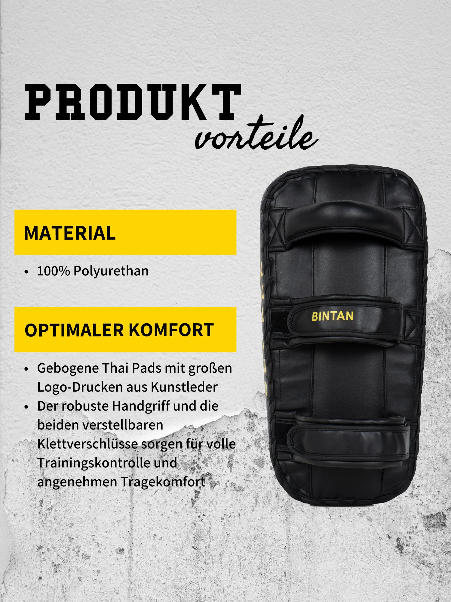 Zwei gebogene Thai Pads mit großen Logo-Drucken aus Kunstleder. Der robuste Handgriff und die beiden verstellbaren Klettverschlüsse sorgen für volle Trainingskontrolle und angenehmen Tragekomfort. Größe: ca. 37cm x 20cm x 9cm (L x B x T)