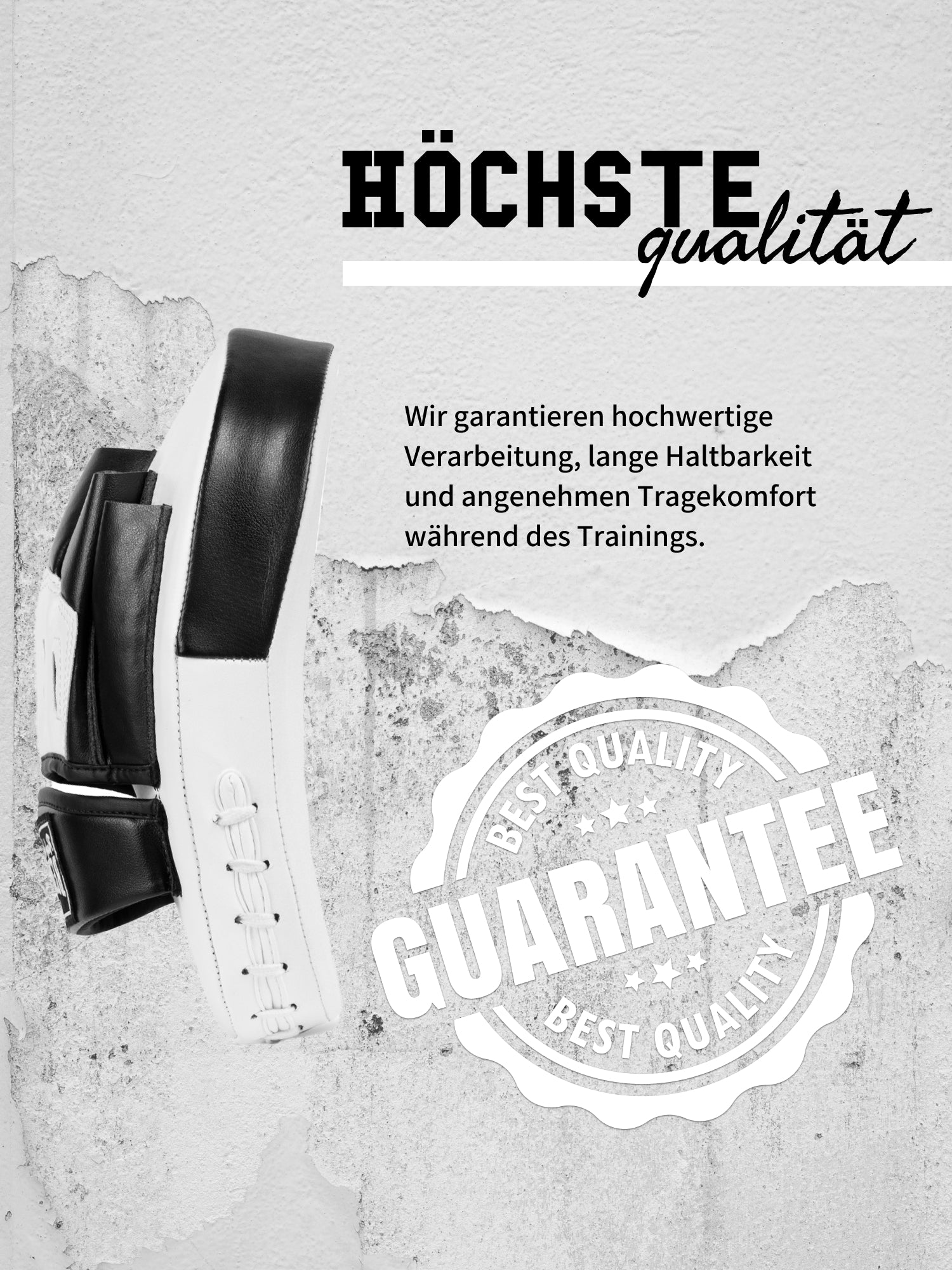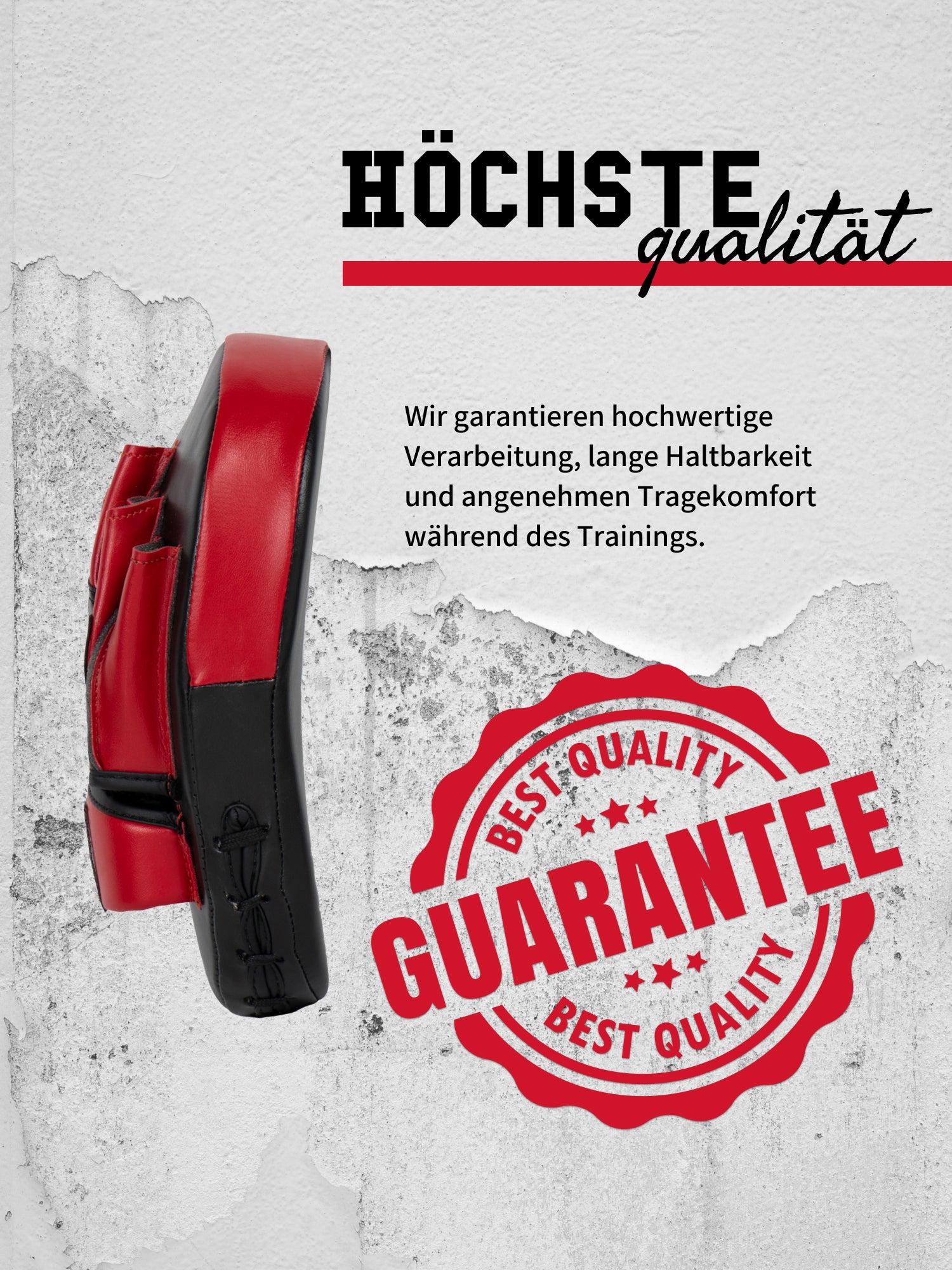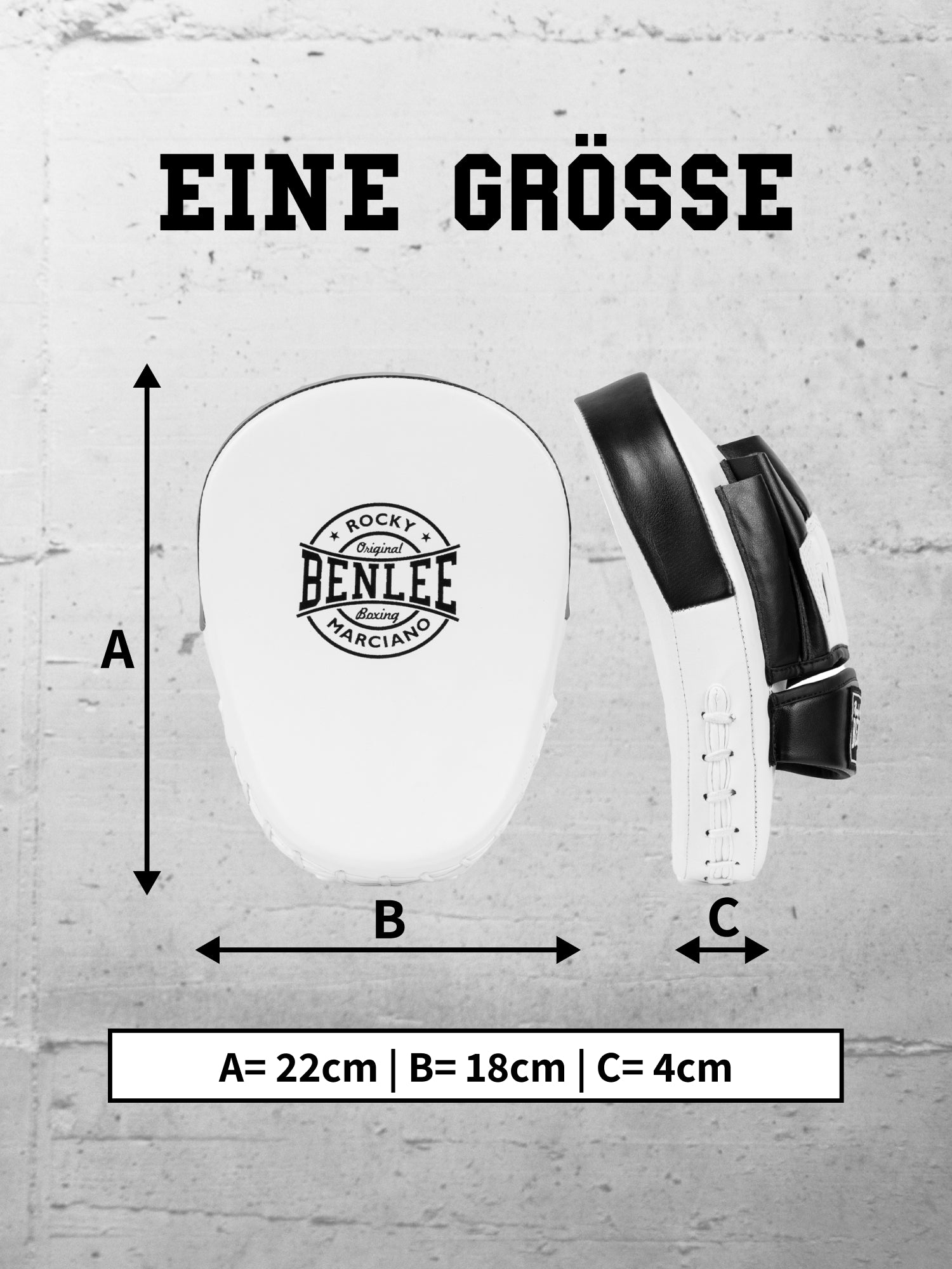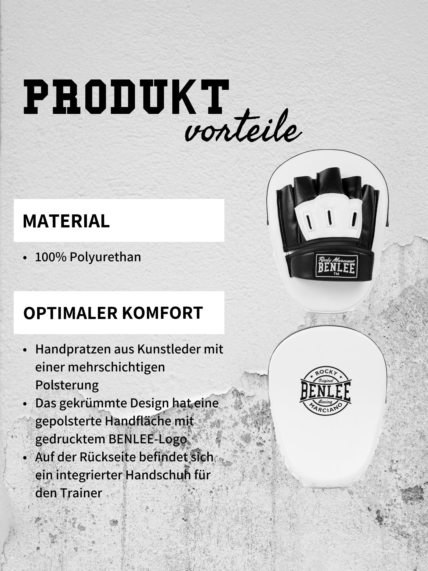 Handpratzen aus Kunstleder mit einer mehrschichtigen Polsterung. Das gekrümmte Design hat eine gepolsterte Handfläche mit gedrucktem BENLEE-Logo. Auf der Rückseite befindet sich ein integrierter Handschuh für den Trainer. Größe: ca 22cm x 18cm x 4cm (H x B x T)