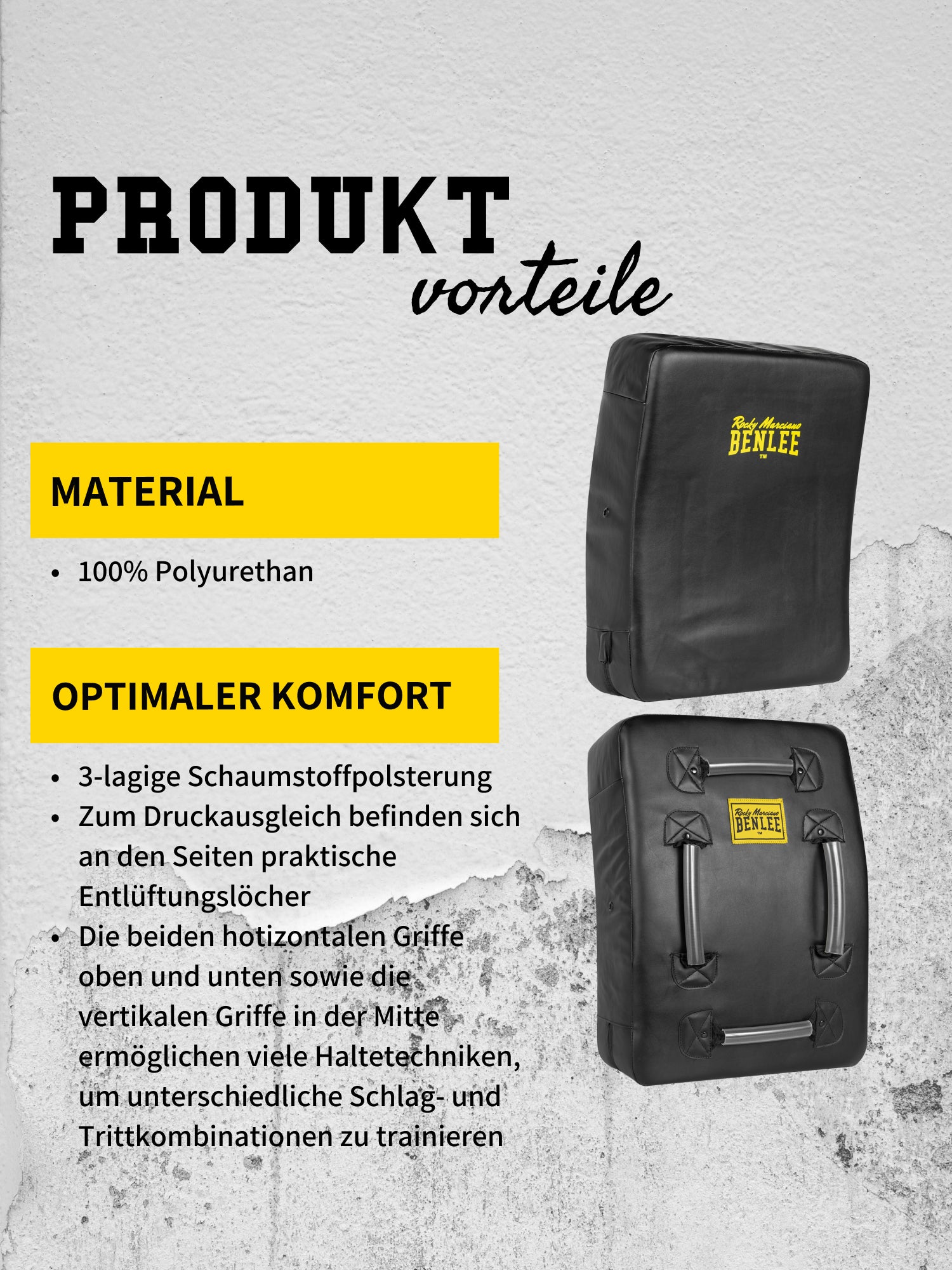 Das gekrümmte Schlagpolster IMPACT von BENLEE hat unter der strapazierfähigen Vinylhülle eine 3-lagige Schaumstoffpolsterung. Zum Druckausgleich befinden sich an den Seiten praktische Entlüftungslöcher. Die beiden hotizontalen Griffe oben und unten sowie die vertikalen Griffe in der Mitte ermöglichen viele Haltetechniken, um unterschiedliche Schlag- und Trittkombinationen zu trainieren. Größe: ca. 55cm x 38cm x 14cm (H x B x T)