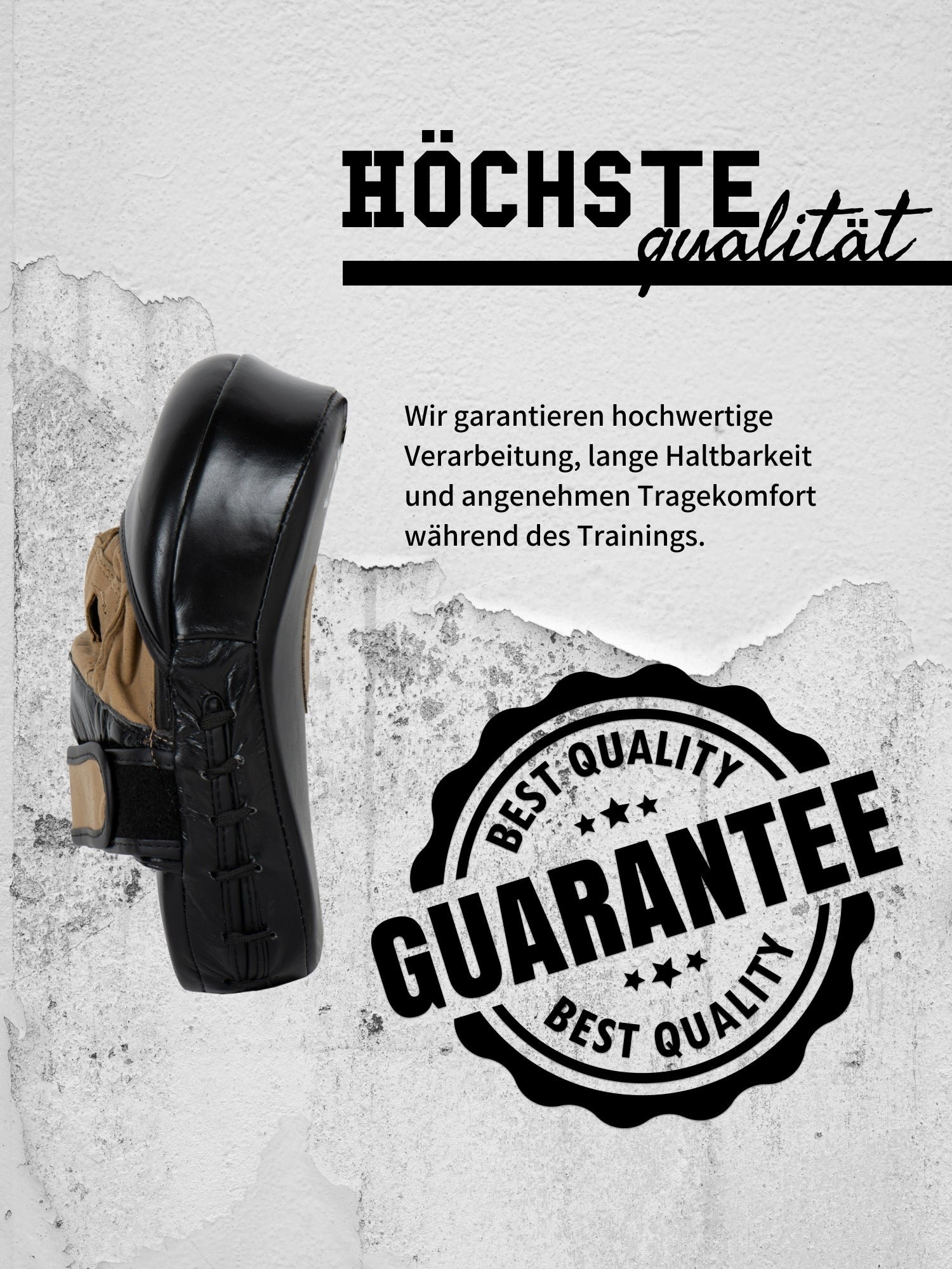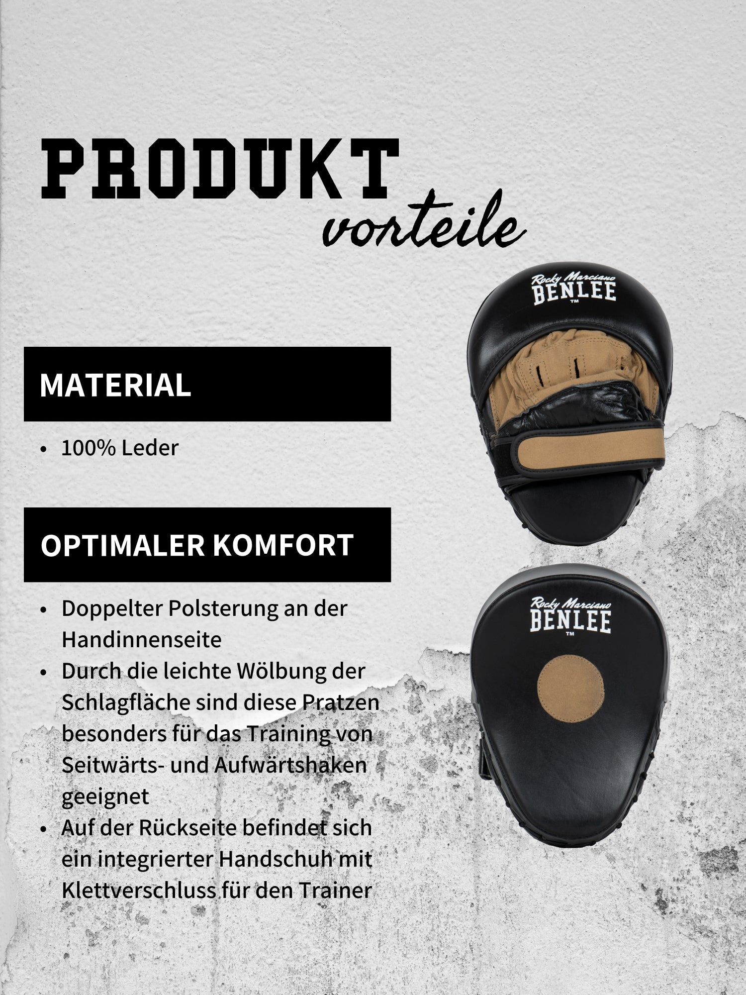 Professionelle, hochwertige Lederpratzen mit doppelter Polsterung an der Handinnenseite. Durch die leichte Wölbung der Schlagfläche sind diese Pratzen besonders für das Training von Seitwärts- und Aufwärtshaken geeignet. Auf der Rückseite befindet sich ein integrierter Handschuh mit Klettverschluss für den Trainer. Sowohl auf der Vorder- als auch auf der Rückseite befinden sich BENLEE Logos und die Wildlederanteile in Kontrastfarbe unterstreichen den klassischen Vintage-Stil der Pratzen. Größe: ca 24cm x 18cm x 5cm (H x B x T)