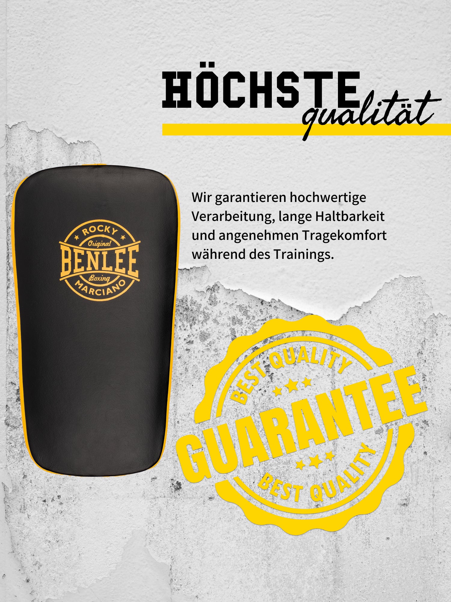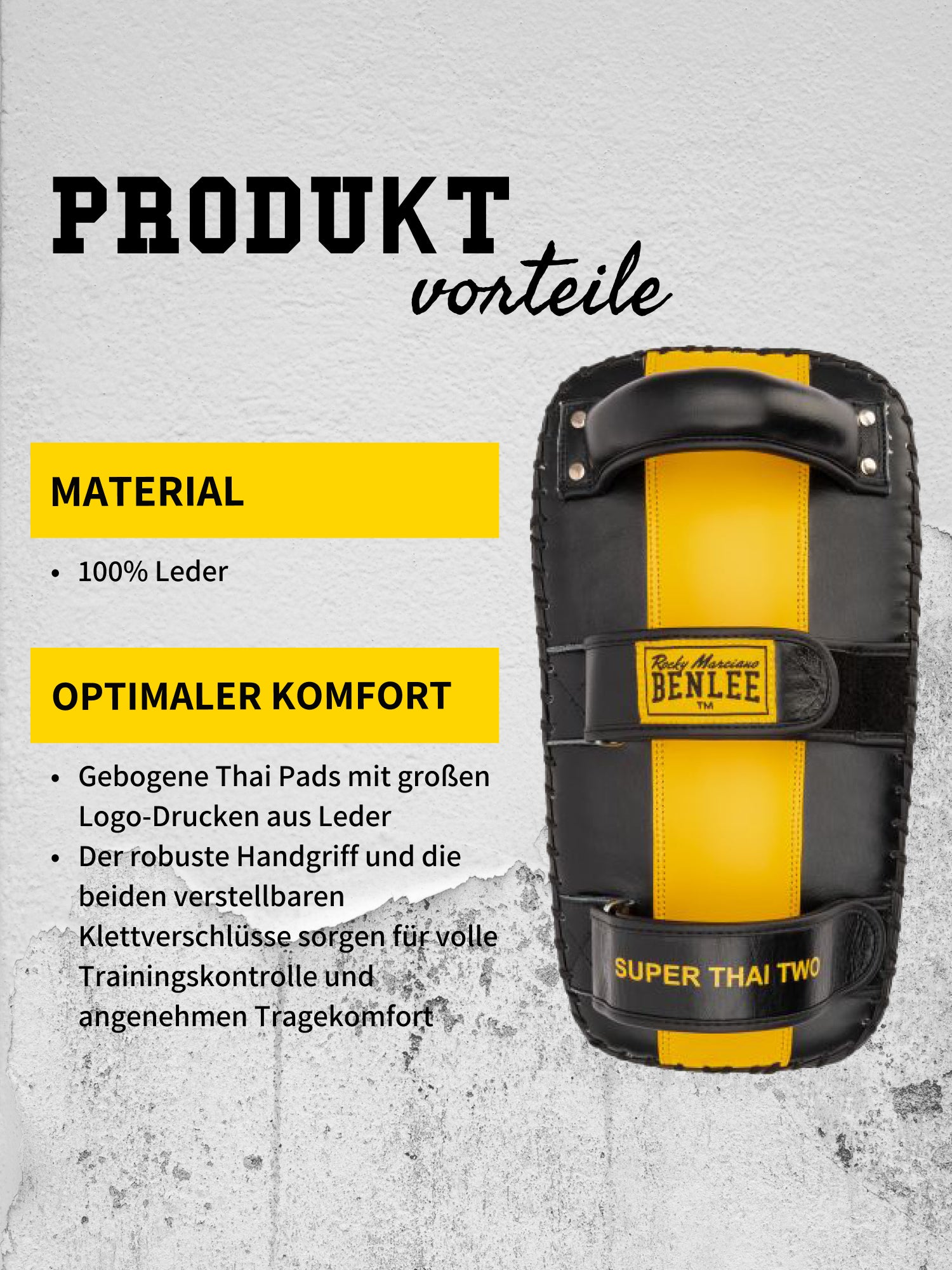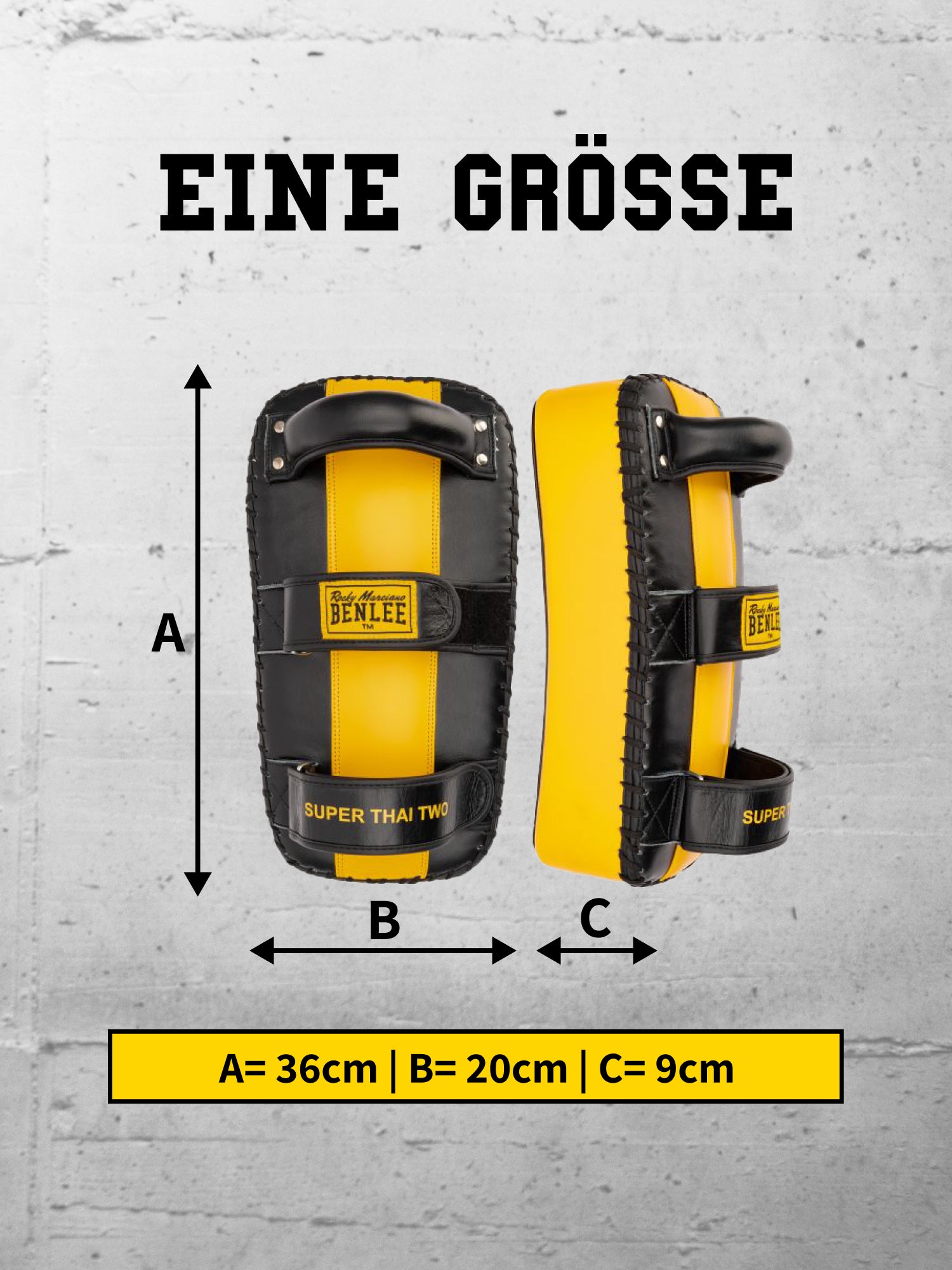 Gebogene Thai Pads mit großen Logo-Drucken aus Leder. Der robuste Handgriff und die beiden verstellbaren Klettverschlüsse sorgen für volle Trainingskontrolle und angenehmen Tragekomfort. Größe: ca. 36cm x 20cm x 9cm (L x B x T)