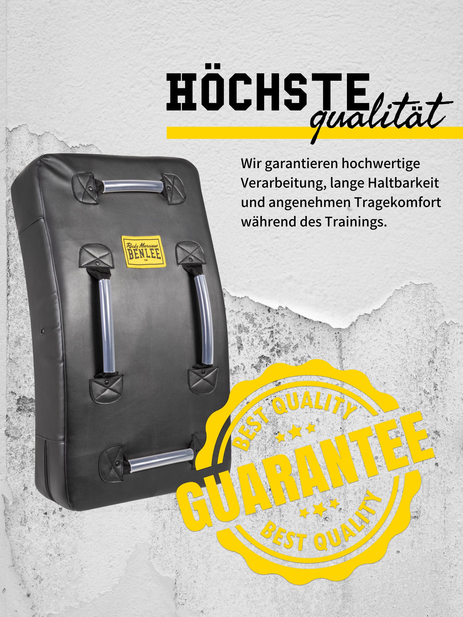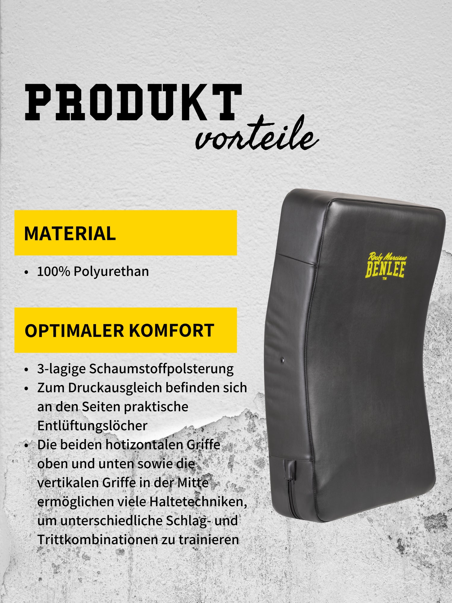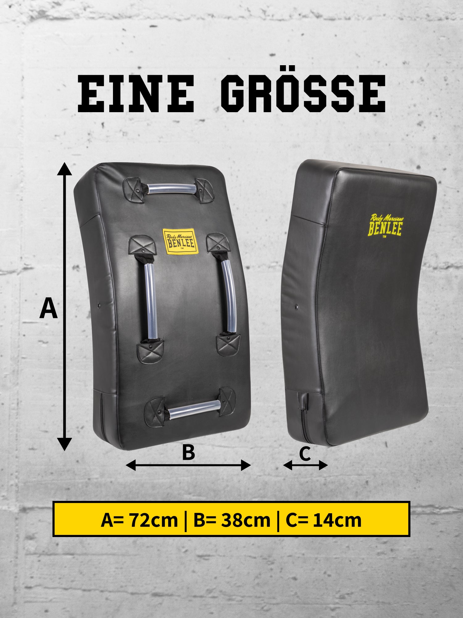 Dieses BENLEE Profi-Schlagpolster TREMBLE in leicht gebogener Form, hat eine 3-lagige Schaumstoffpolsterung unter dem strapazierfähigen Vinylbezug. Die Griffe auf der Rückseite ermöglichen verschiedene Haltetechniken, um mehrere Schlag- und Trittkombinationen zu trainieren. Größe: ca. 72cm x 38cm x 14cm (H x B x T)