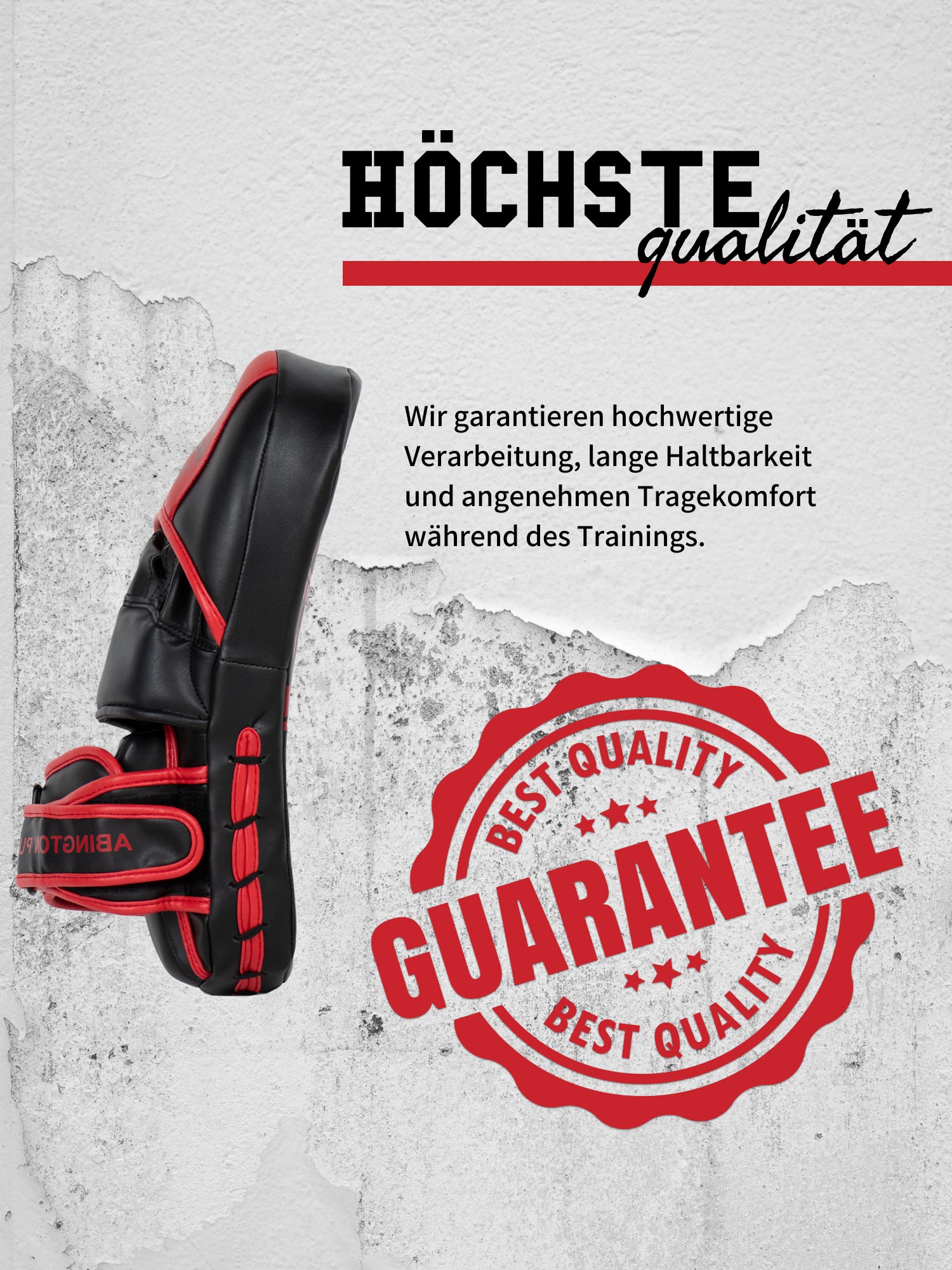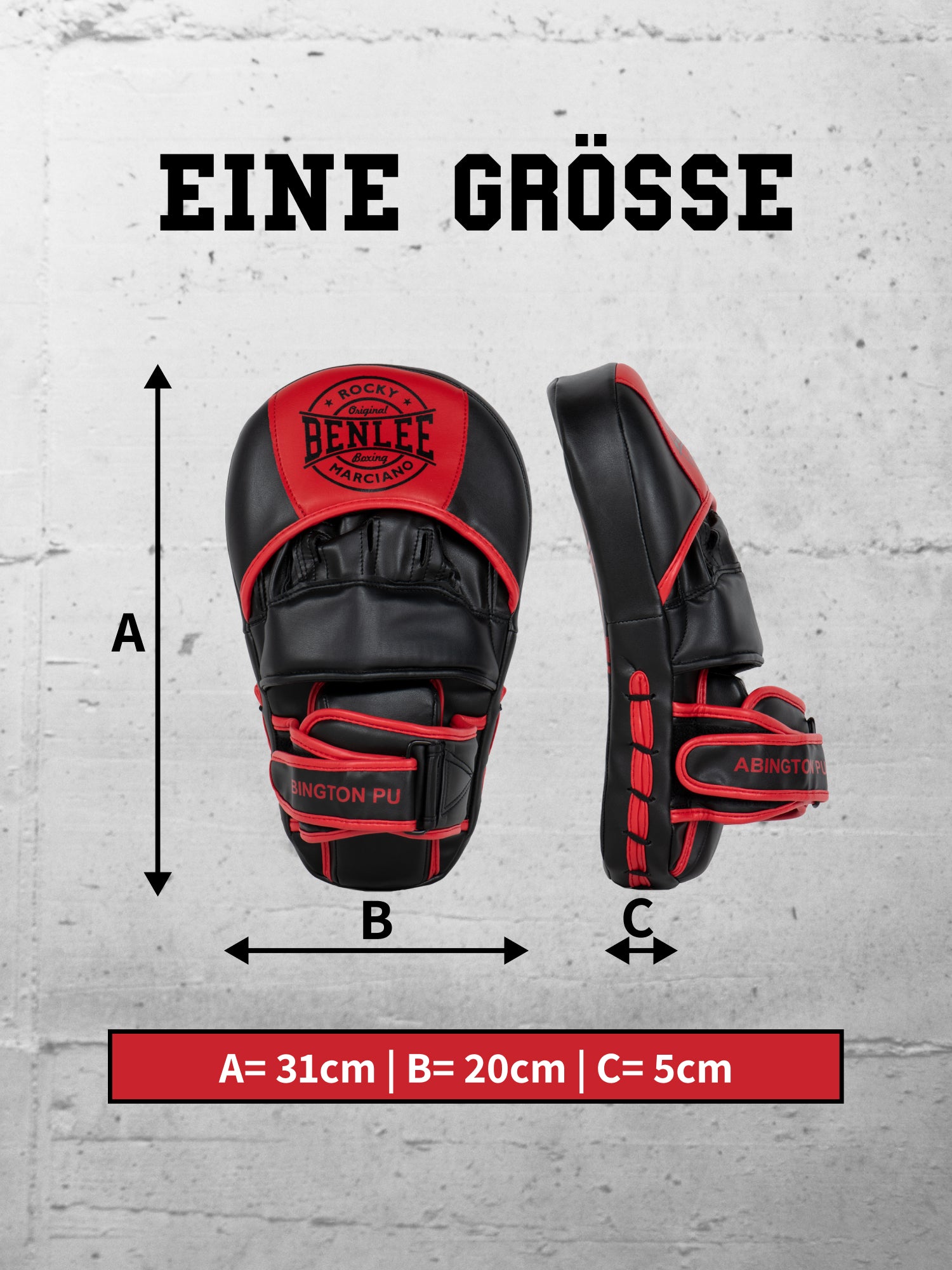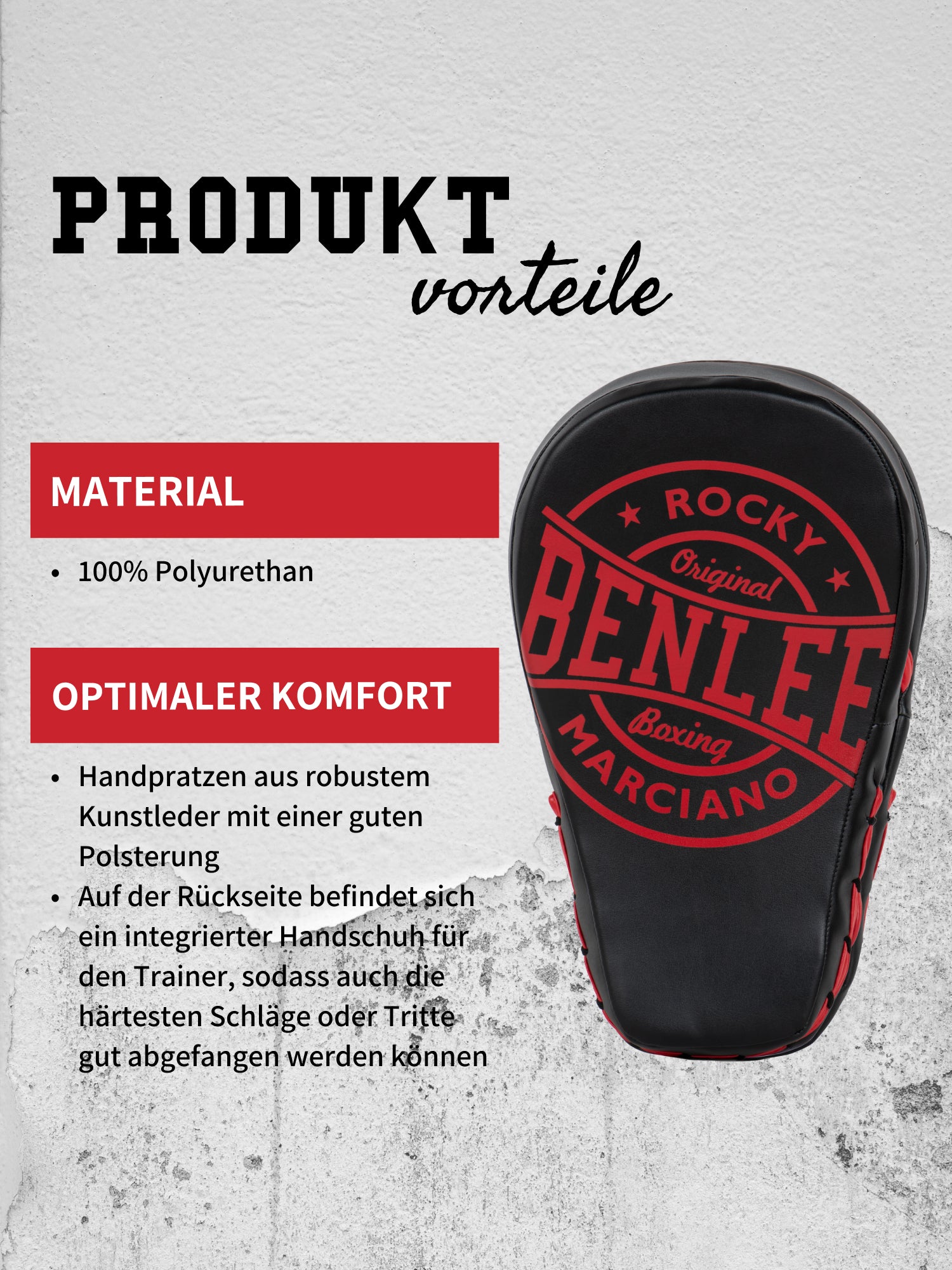Handpratzen aus robustem Kunstleder mit einer guten Polsterung. Das gekrümmte Design hat eine gepolsterte Handfläche mit gedrucktem BENLEE-Logo. Dieses ist nicht nur optisch ansprechend, sondern kann gleichzeitig als Zielpunkt anvisiert werden. Auf der Rückseite befindet sich ein integrierter Handschuh für den Trainer, sodass auch die härtesten Schläge oder Tritte gut abgefangen werden können. Größe: ca 31cm x 20cm x 5cm (H x B x T)