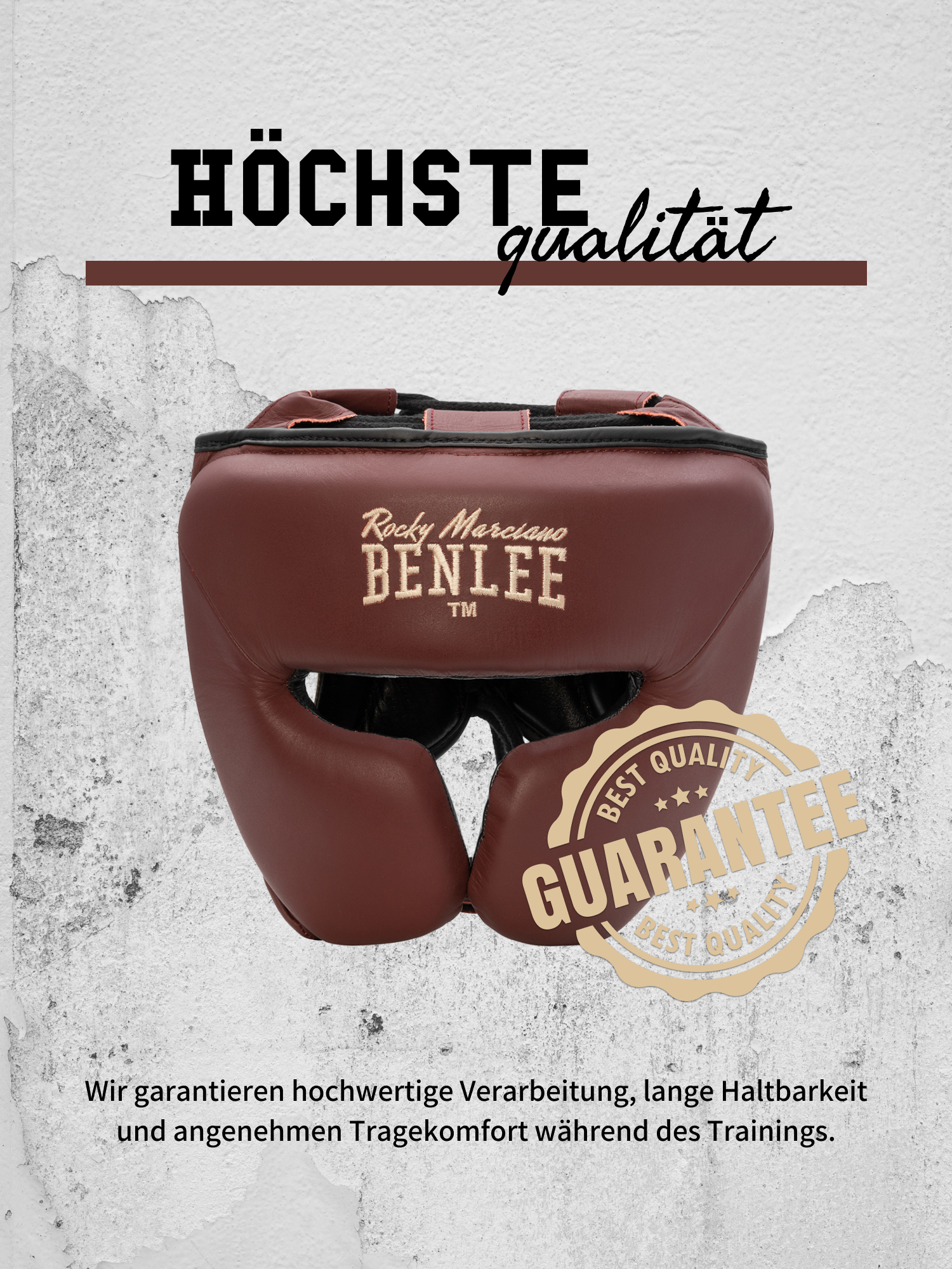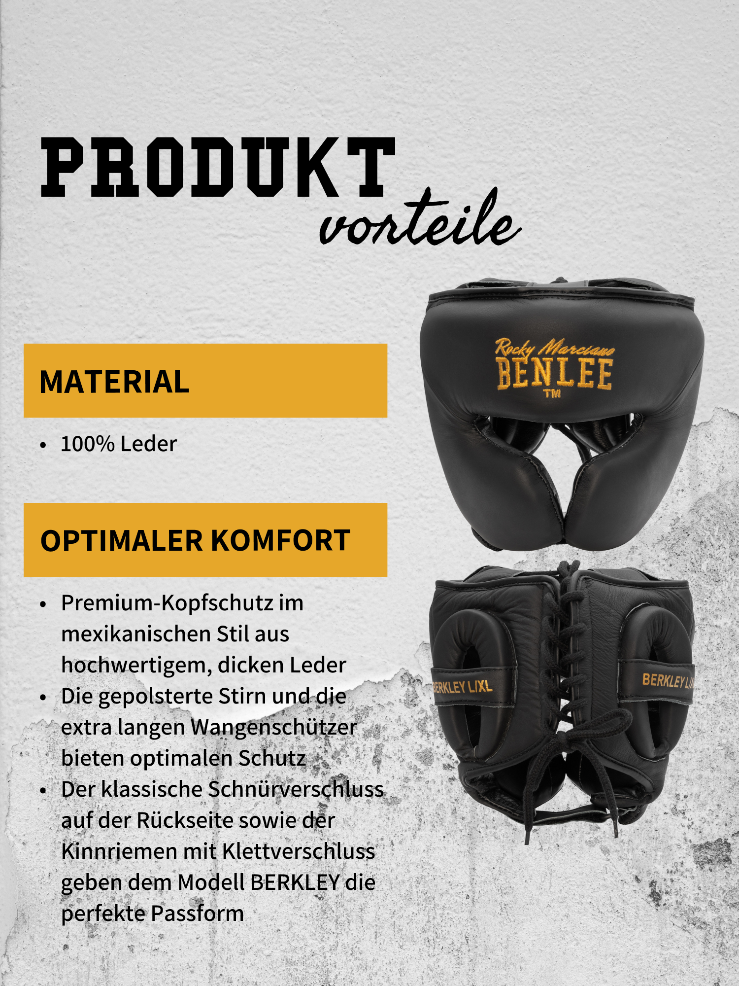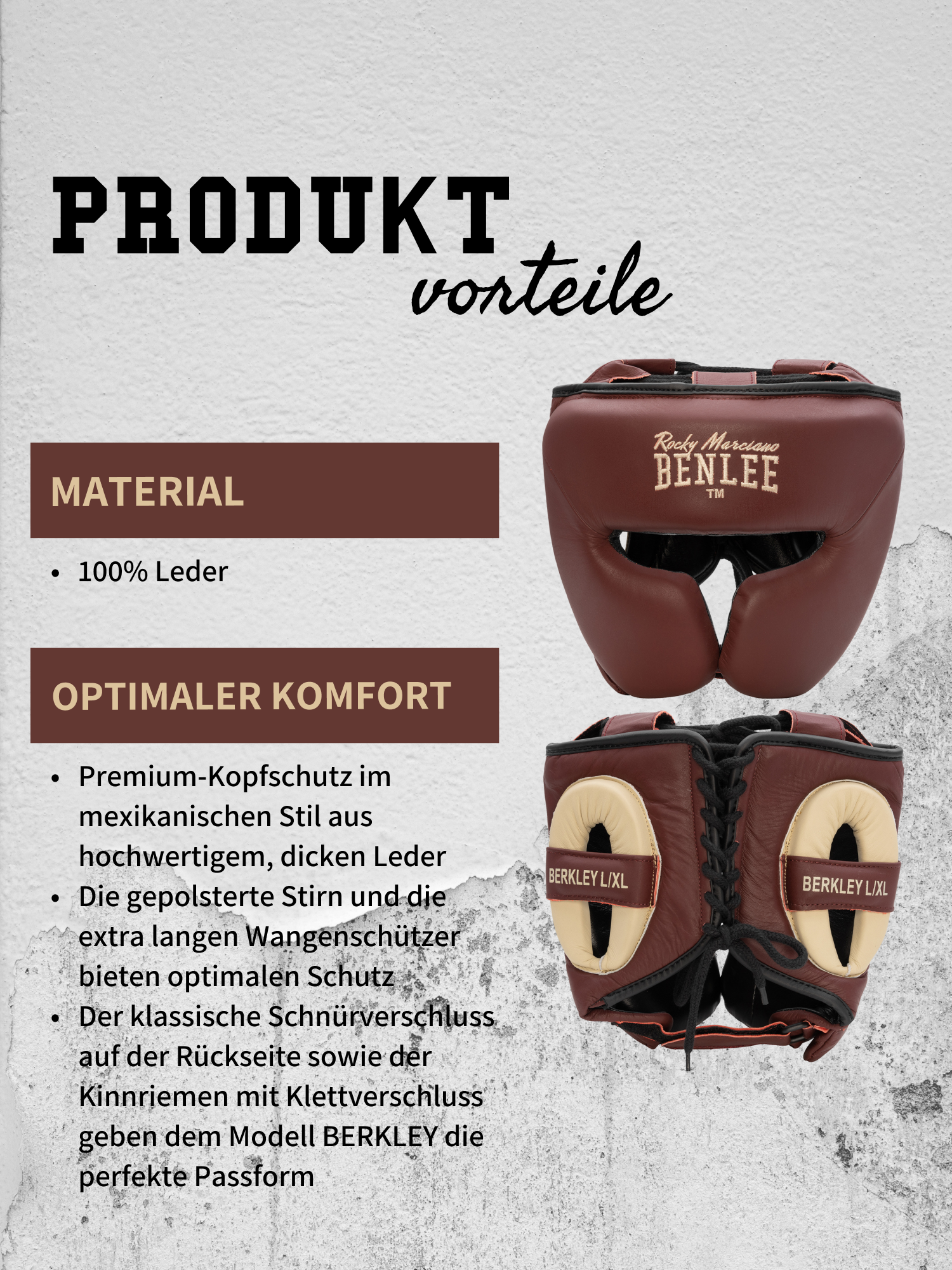 Premium-Kopfschutz im mexikanischen Stil aus hochwertigem, dicken Leder. Die gepolsterte Stirn und die extra langen Wangenschützer bieten optimalen Schutz. Der klassische Schnürverschluss auf der Rückseite sowie der Kinnriemen mit Klettverschluss geben dem Modell BERKLEY die perfekte Passform.