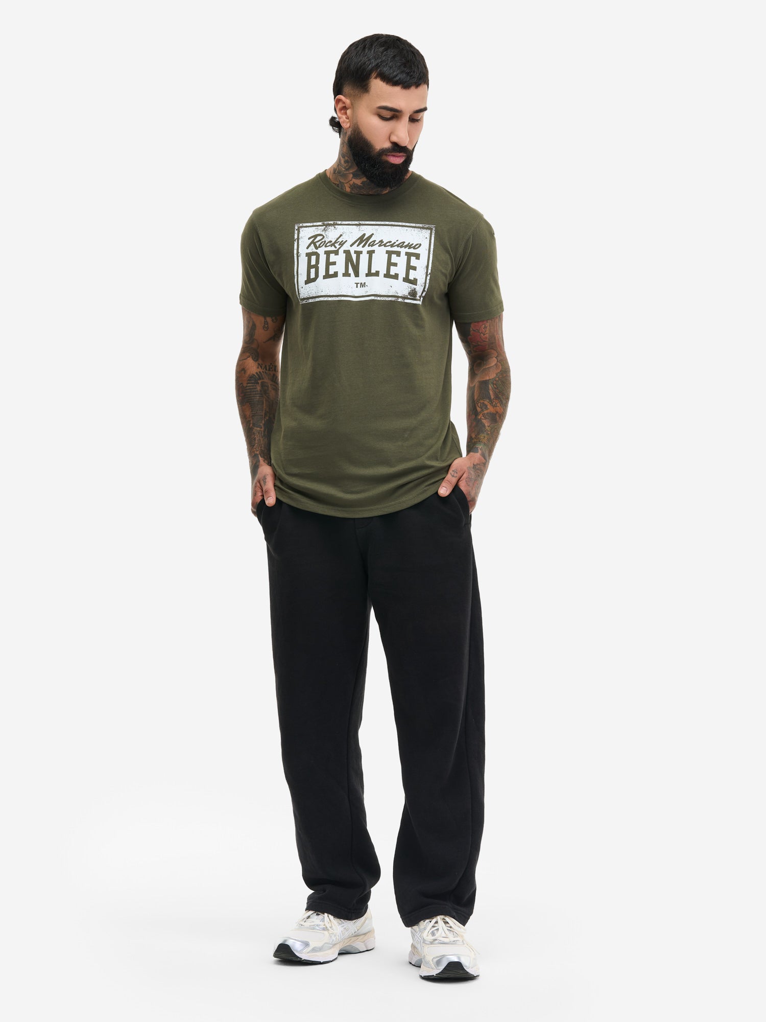 Das BENLEE T-Shirt braucht nicht viel, um ein echter Hingucker zu sein: denn der große Logo-Druck auf der Brust zieht mit seiner Vintage/Cracked-Optik alle Blicke auf sich. Auf dem rechten Schulterblatt ist ebenfalls ein kleiner Druck. Dort steht in geschwungener Schrift "The Brockton Blockbuster". Neben der tollen Optik weist das Shirt durch die Verwendung von hochwertiger Baumwolle auch einen hohen Tragekomfort auf. Nicht nur beim Sport, sondern auch im Alltag macht das T-Shirt richtig was her! Jeans im Used-Look und lässige Sneakers runden das Styling ab.