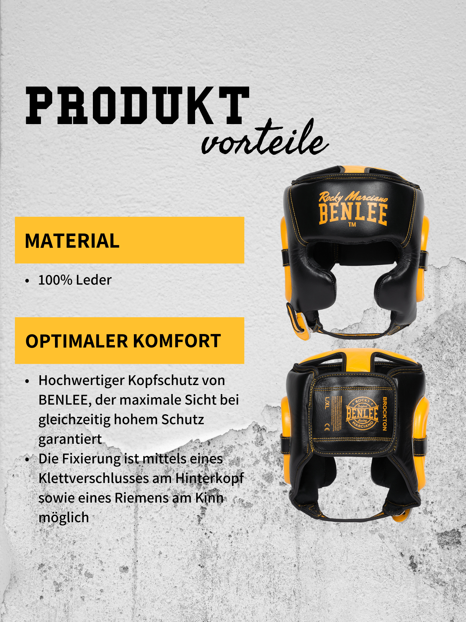 Hochwertiger Kopfschutz von BENLEE, der maximale Sicht bei gleichzeitig hohem Schutz garantiert. Die Fixierung ist mittels eines Klettverschlusses am Hinterkopf sowie eines Riemens am Kinn möglich. Auf dem Stirnbereich sowie dem rückwärtigen Verschluss befindet sich ein BENLEE-Logo.