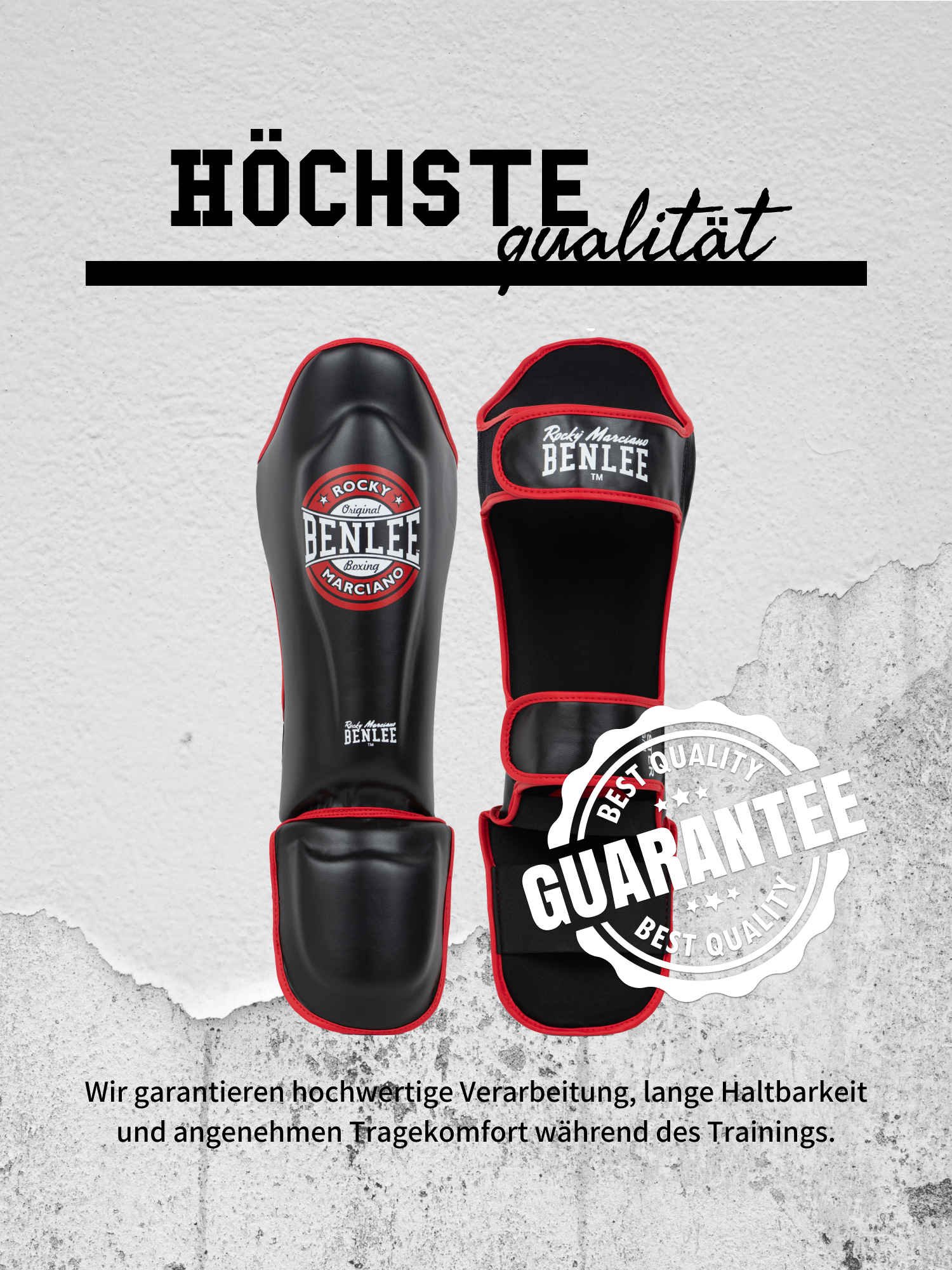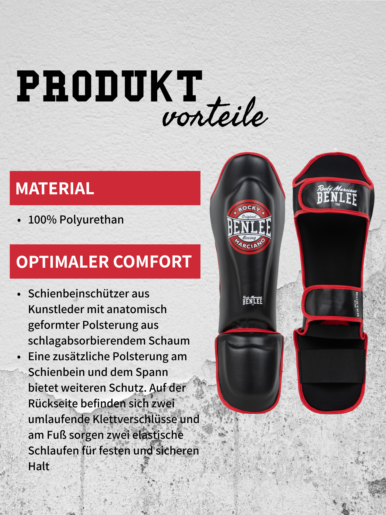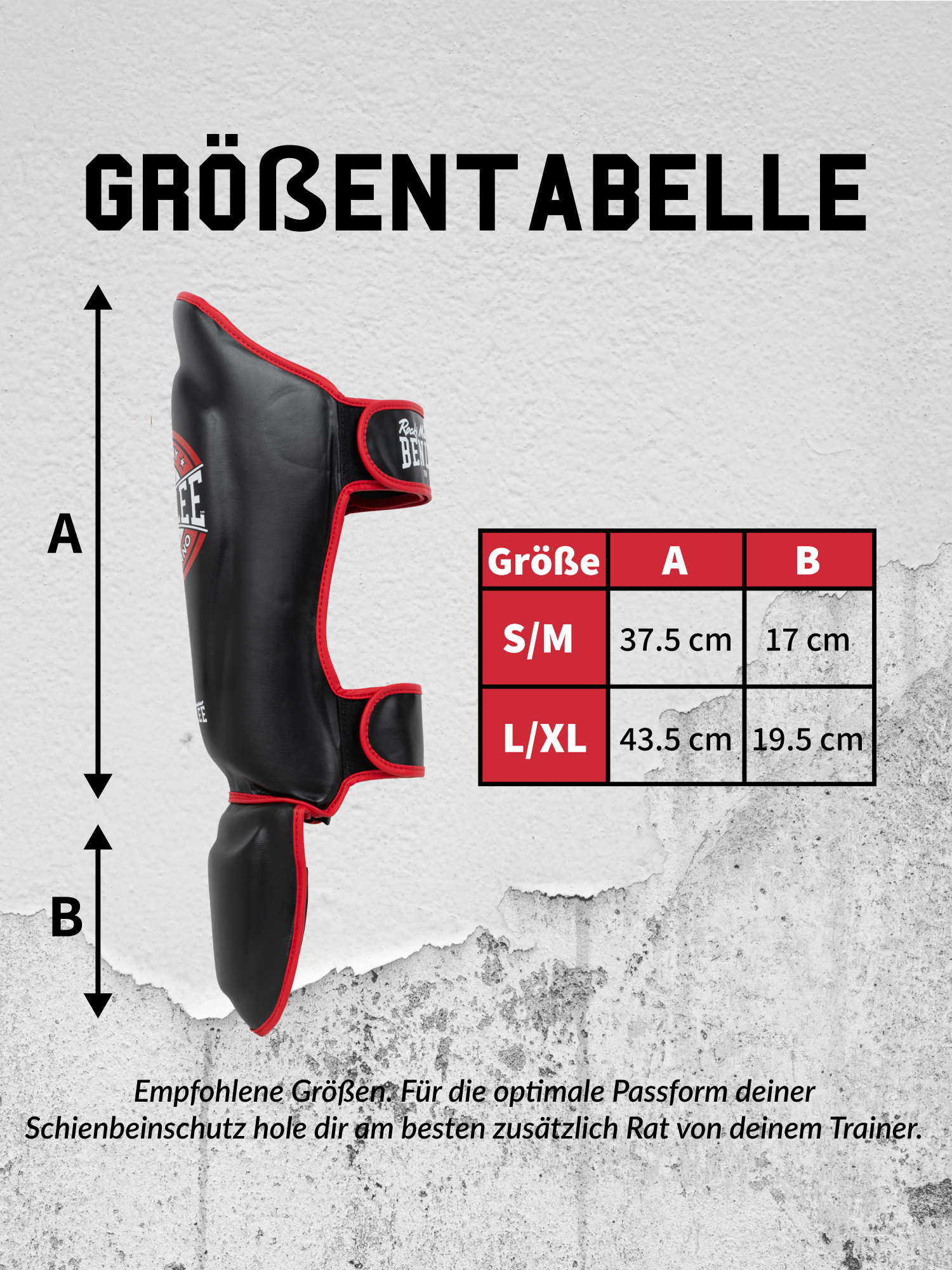 Schienbeinschützer aus Kunstleder mit anatomisch geformter Polsterung aus schlagabsorbierendem Schaum. Eine zusätzliche Polsterung am Schienbein und dem Spann bietet weiteren Schutz. Auf der Rückseite befinden sich zwei umlaufende Klettverschlüsse und am Fuß sorgen zwei elastische Schlaufen für festen und sicheren Halt. BUSTER schützt zuverlässig während des professionellen Trainings von Tritttechniken und sieht dank des gedruckten Logos auch noch cool aus. Größen: S/M (Schienbein 37,5cm, Spann 17cm) und L/XL (Schienbein 43,5cm, Spann 19,5cm)
