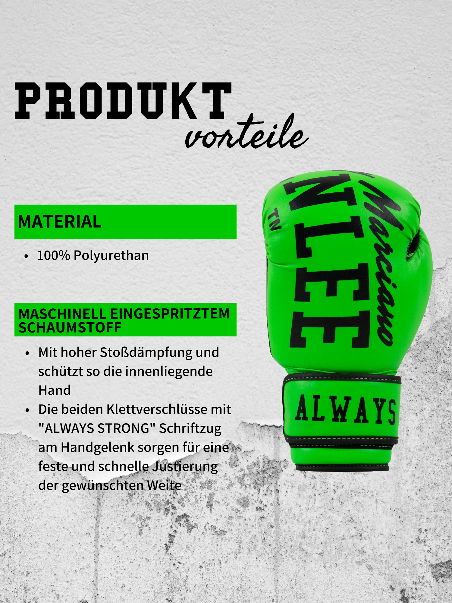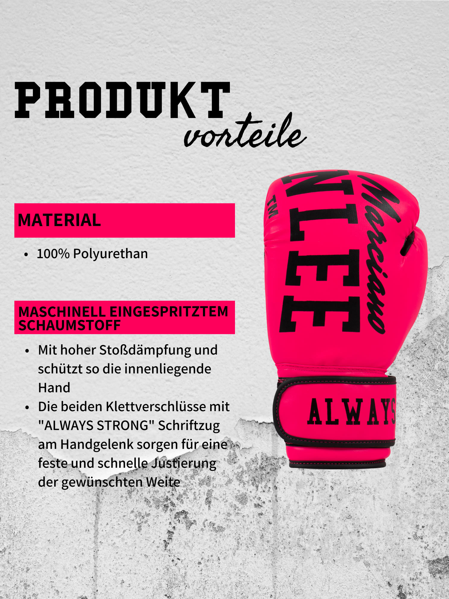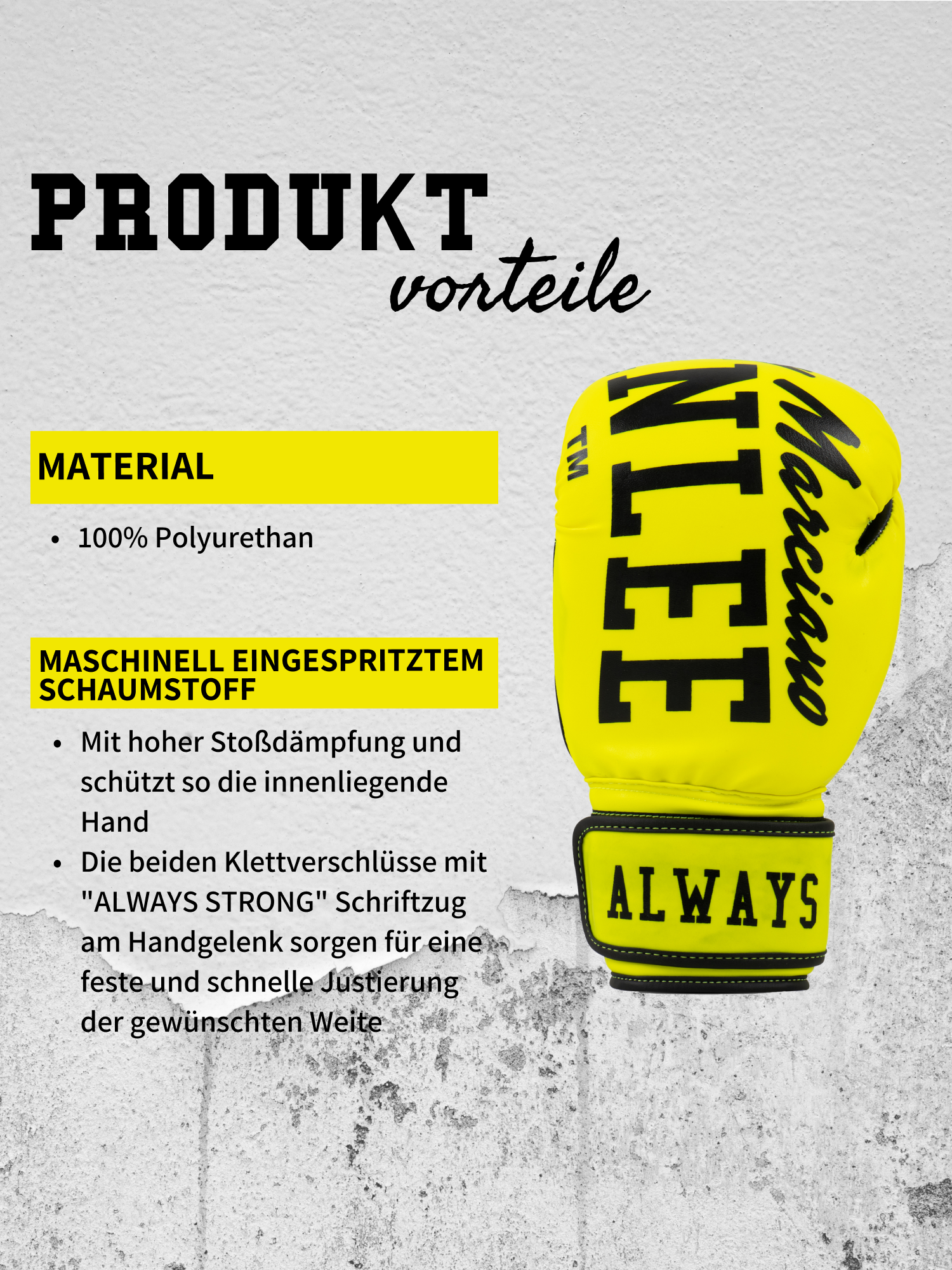 Du willst beim Training nicht nur gut ausgerüstet sein sondern gleichzeitig auch auffallen? Dann sind die CHUNKY B Handschuhe in leuchtenden Neonfarben genau das Richtige für dich. Die Füllung besteht aus maschinell eingespritztem Schaumstoff mit hoher Stoßdämpfung und schützt so die innenliegende Hand. Die beiden Klettverschlüsse mit "ALWAYS STRONG" Schriftzug am Handgelenk sorgen für eine feste und schnelle Justierung der gewünschten Weite. Und der letzte Clou: werden die beiden Handschuhe aneinander gehalten, entsteht das komplette BENLEE Logo.