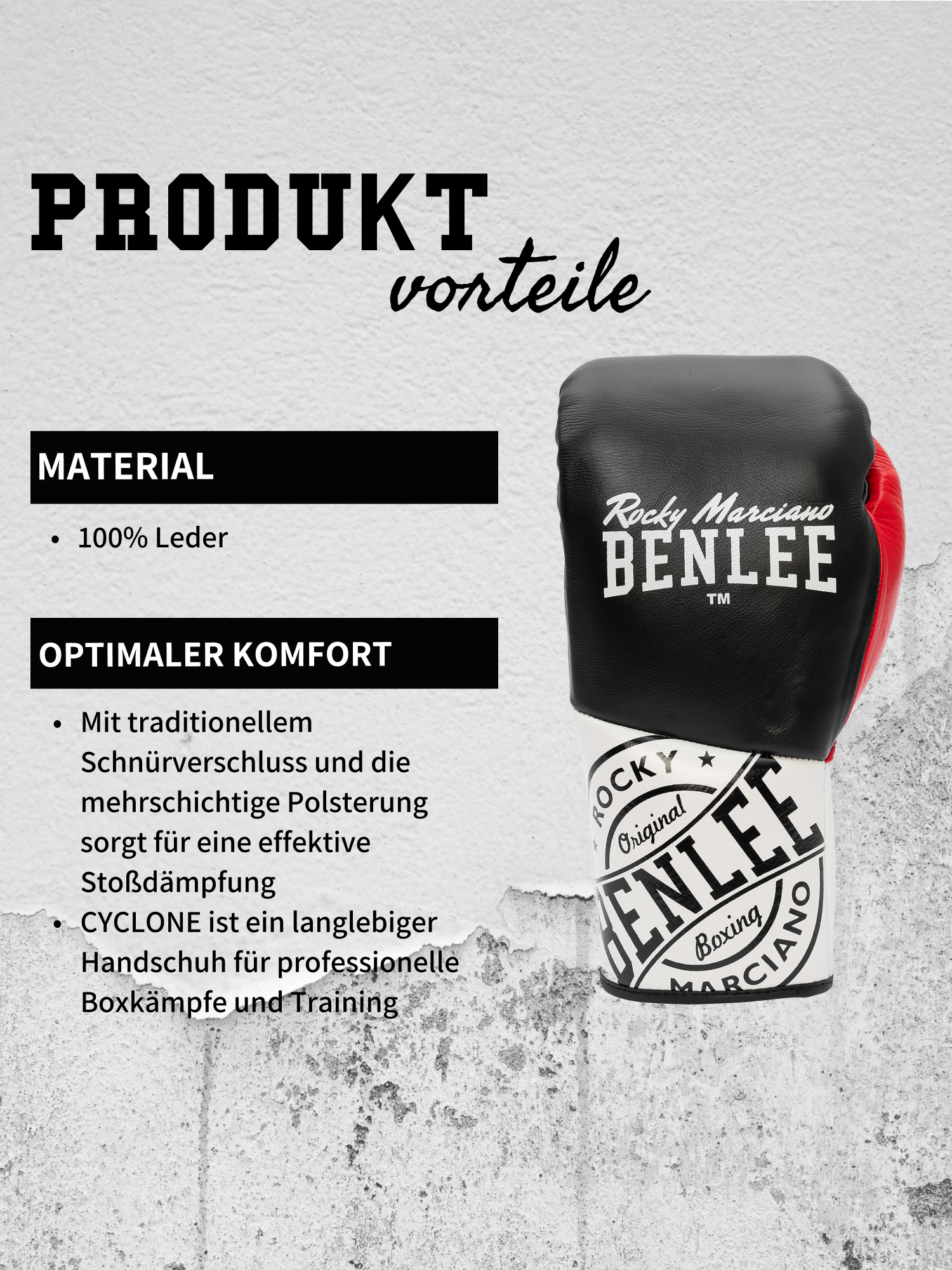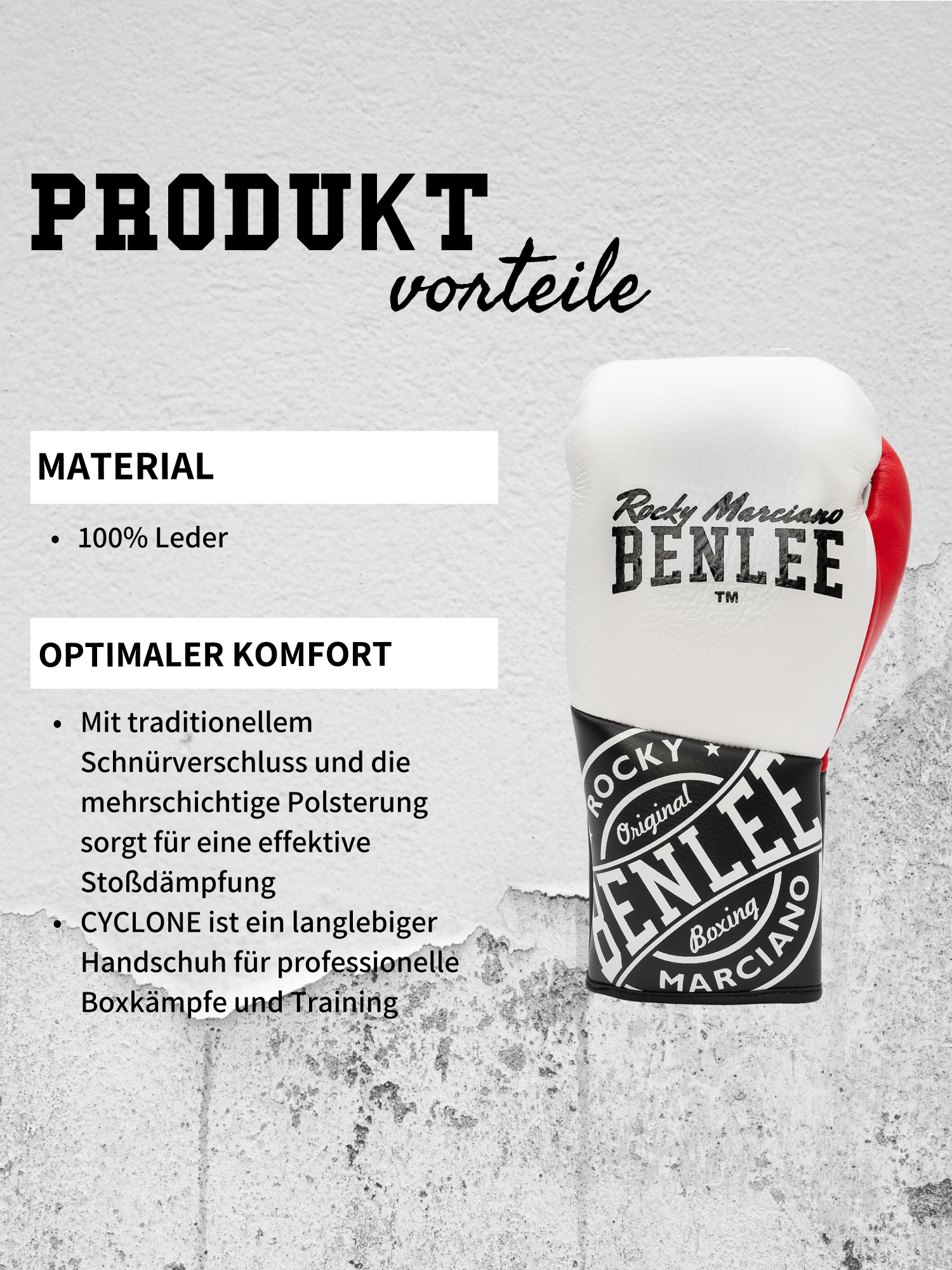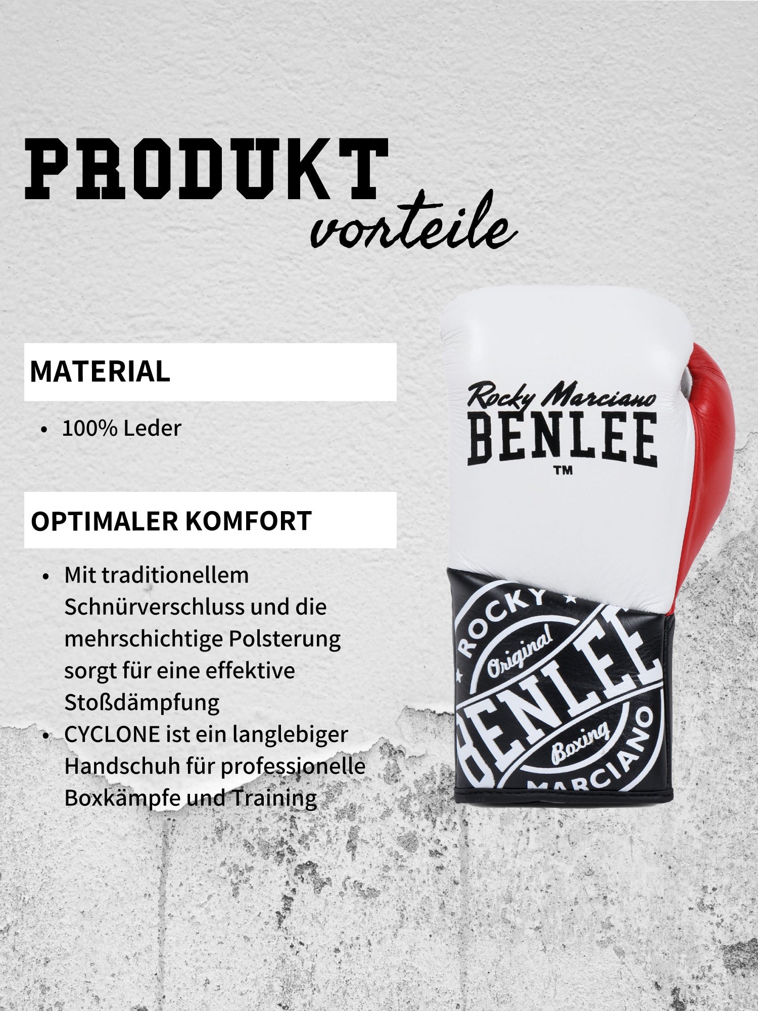 Die neuen professionellen Kampfhandschuhe von BENLEE bieten ultimativen Schutz. Denn sie sind hergestellt aus hochwertigem Rindsleder mit traditionellem Schnürverschluss und die mehrschichtige Polsterung sorgt für eine effektive Stoßdämpfung. CYCLONE ist ein langlebiger Handschuh für professionelle Boxkämpfe und Training.
