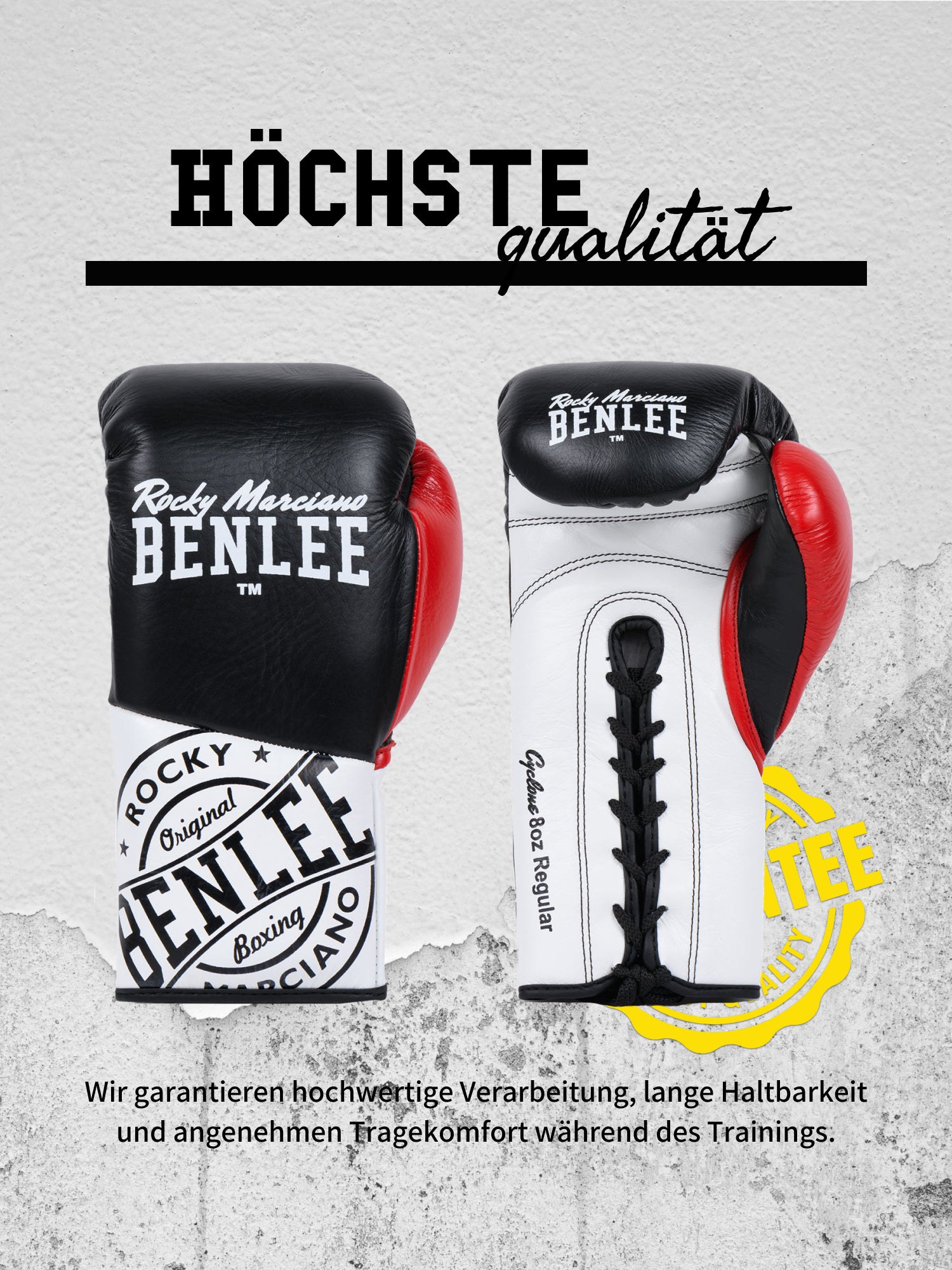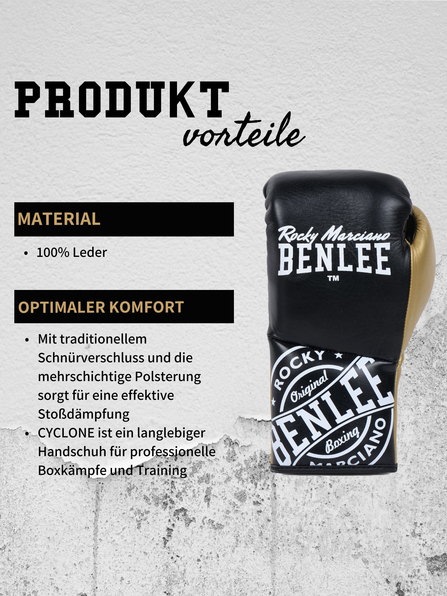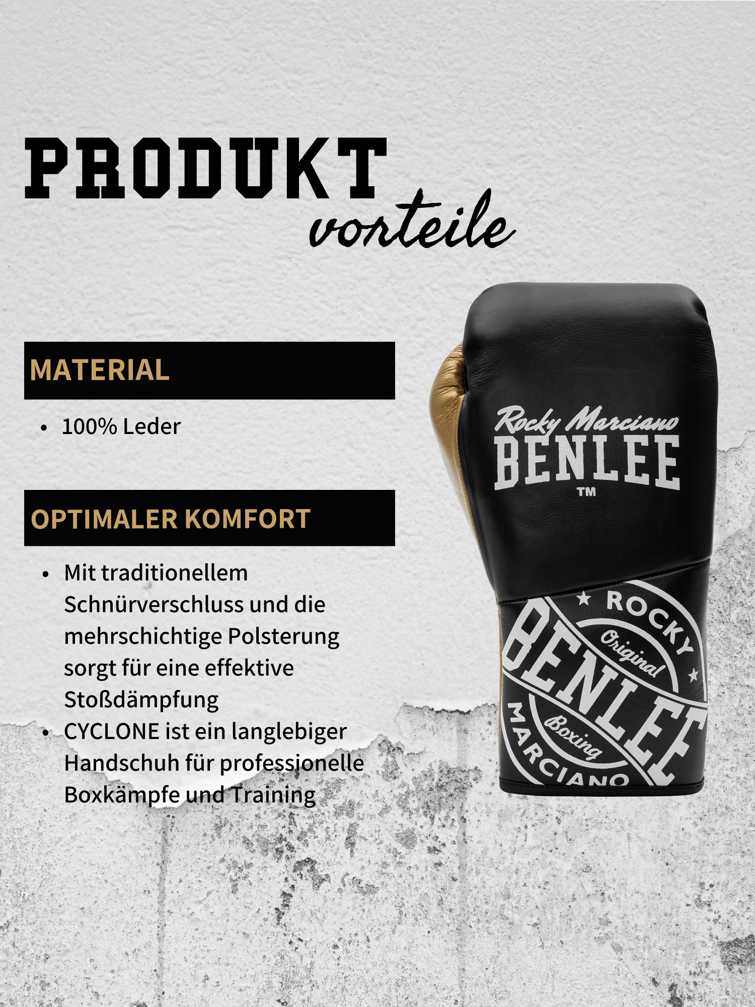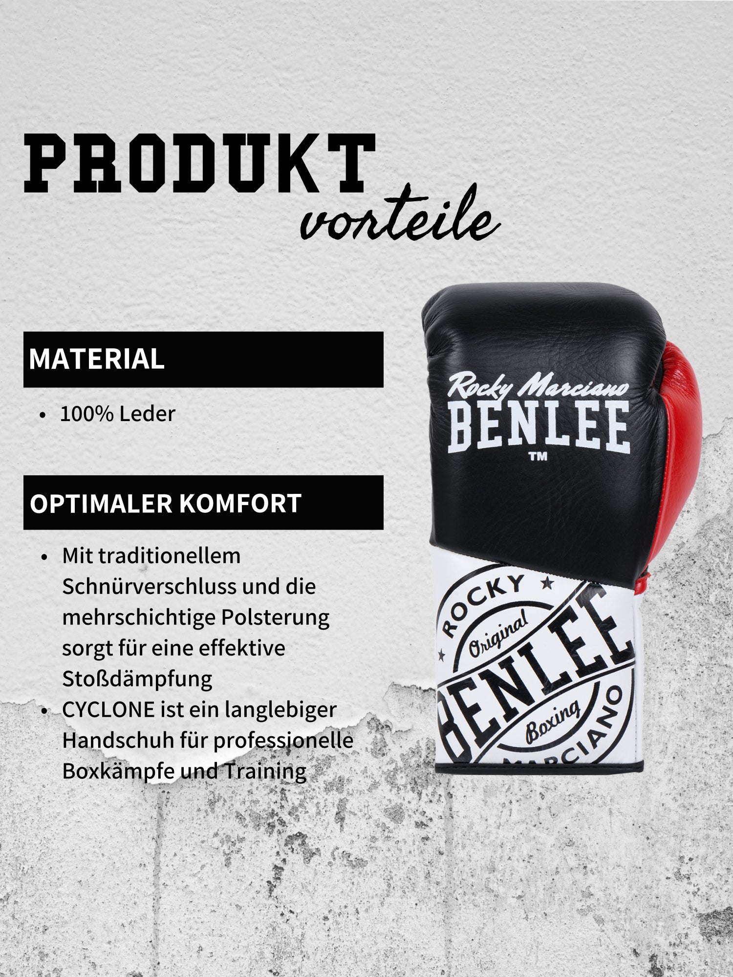 Die neuen professionellen Kampfhandschuhe von BENLEE bieten ultimativen Schutz. Denn sie sind hergestellt aus hochwertigem Rindsleder mit traditionellem Schnürverschluss und die mehrschichtige Polsterung sorgt für eine effektive Stoßdämpfung. CYCLONE ist ein langlebiger Handschuh für professionelle Boxkämpfe und Training.