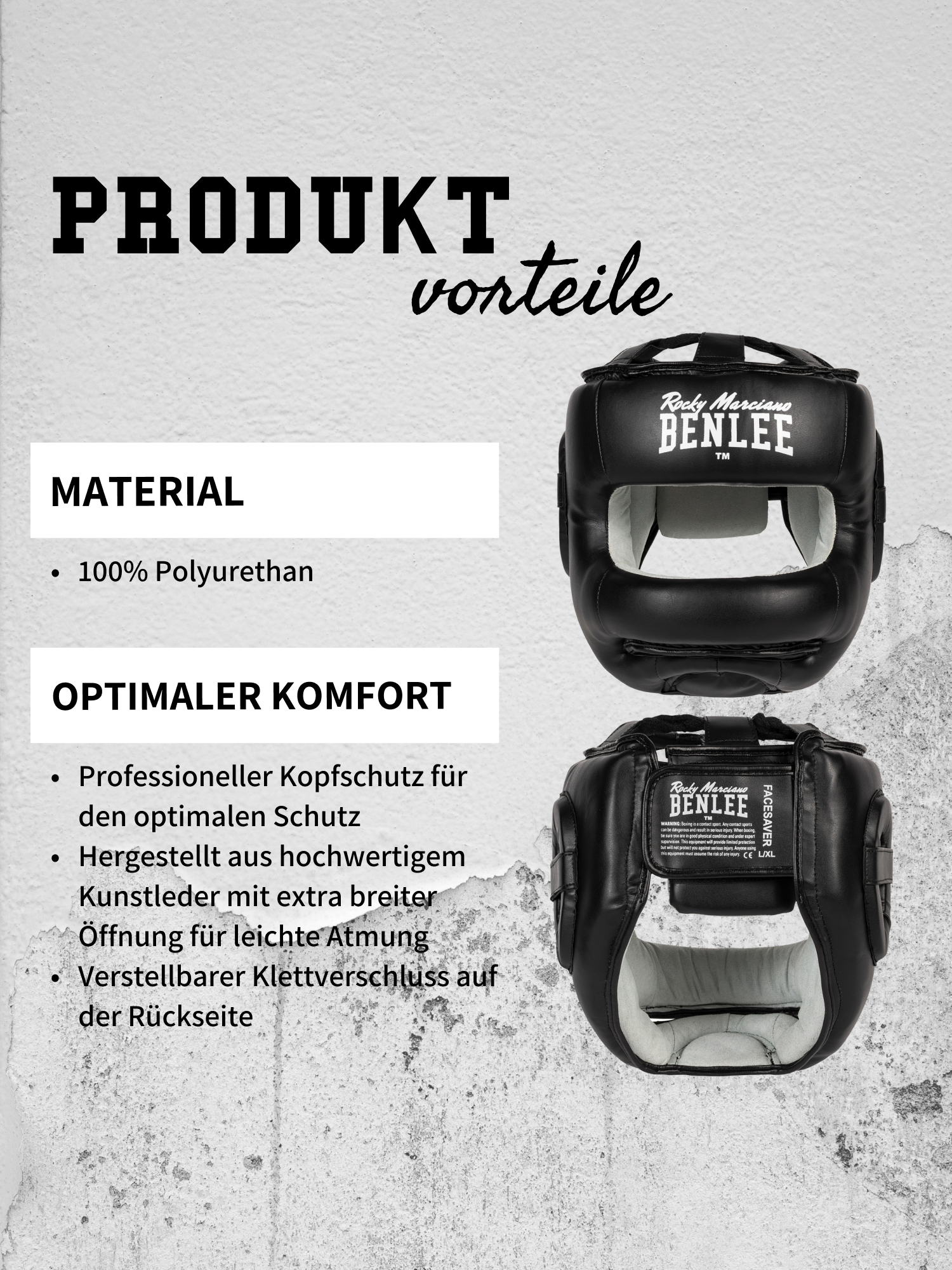 Professioneller Kopfschutz für den optimalen Schutz. Hergestellt aus hochwertigem Kunstleder mit extra breiter Öffnung für leichte Atmung. Verstellbarer Klettverschluss auf der Rückseite.