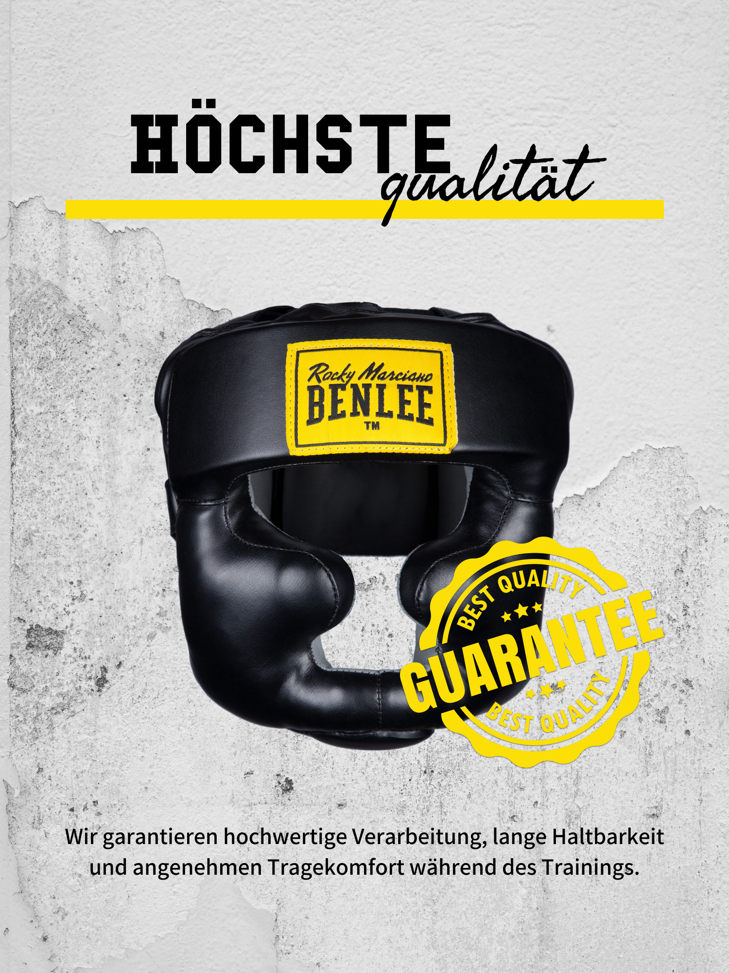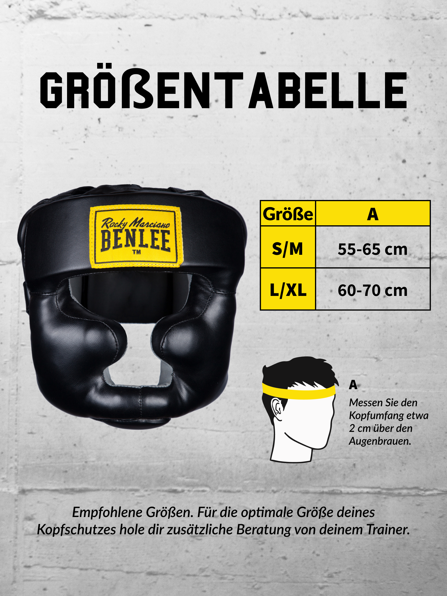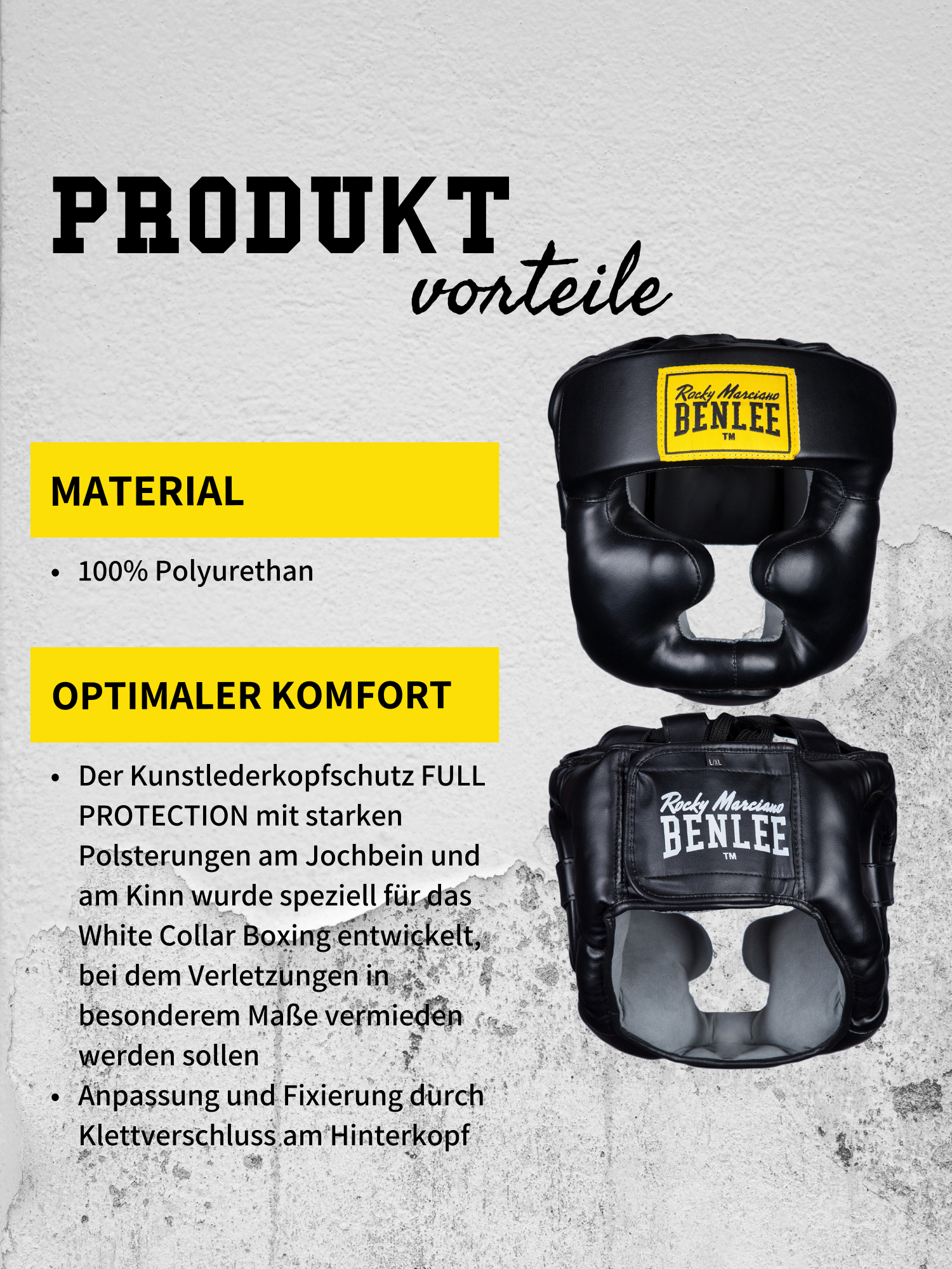 Der Kunstlederkopfschutz FULL PROTECTION mit starken Polsterungen am Jochbein und am Kinn wurde speziell für das White Collar Boxing entwickelt, bei dem Verletzungen in besonderem Maße vermieden werden sollen. Anpassung und Fixierung durch Klettverschluss am Hinterkopf. Maße: Größe S/M für Kopfumfänge 55-65cm, Größe L/XL für Kopfumfänge 60-70cm.