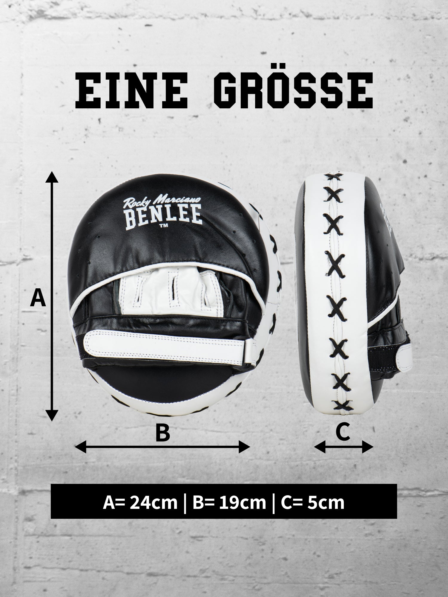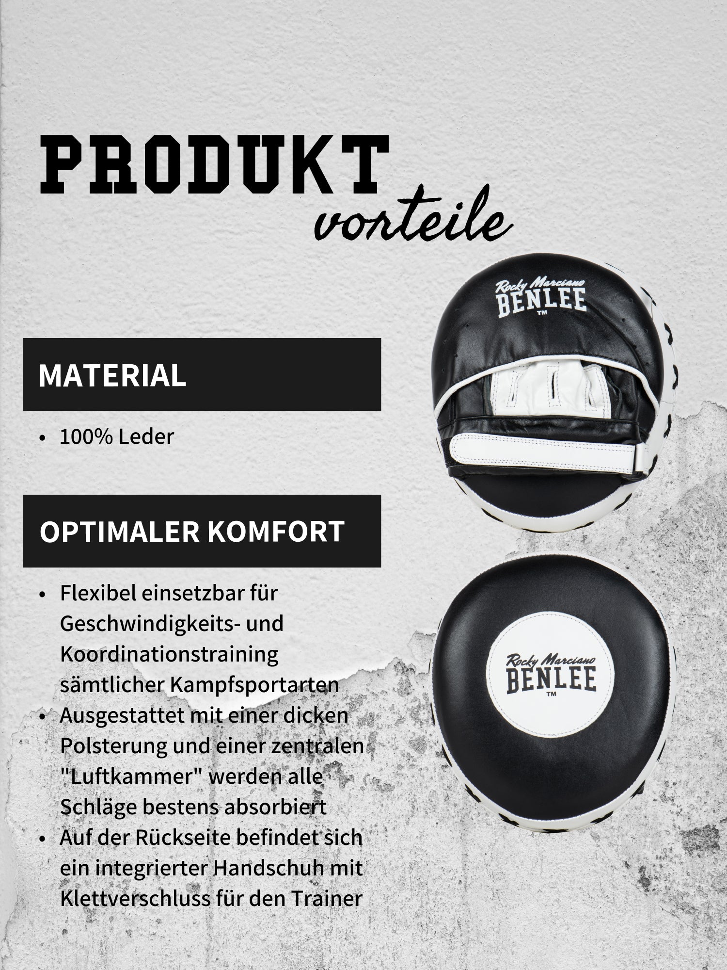 Professionelle, hochwertige Lederpratzen von BENLEE, leicht und somit flexibel einsetzbar für Geschwindigkeits- und Koordinationstraining sämtlicher Kampfsportarten. Ausgestattet mit einer dicken Polsterung und einer zentralen "Luftkammer" werden alle Schläge bestens absorbiert. Auf der Rückseite befindet sich ein integrierter Handschuh mit Klettverschluss für den Trainer. Die beiden klassischen BENLEE-Logos sind ein Blickfang, wobei das Logo auf der Vorderseite als Zielpunkt anvisiert werden kann. Größe: ca 24cm x 18cm x 5cm (H x B x T)